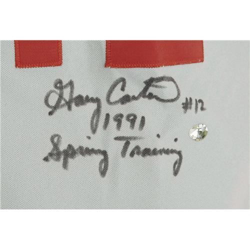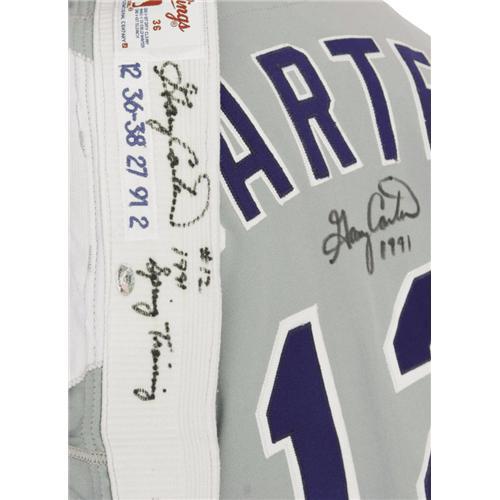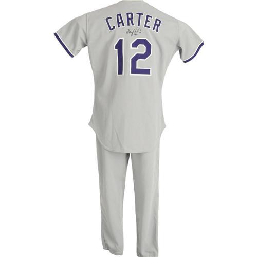 <B>1991 Gary Carter Spring Training Game Worn Uniform.</B></I> One of the toughest uniforms out there from this Hall of Fame catcher, as The Kid represented the City of Angels for just a single season in the waning years of his incredible career. The road grey jersey offers the classic "Dodgers" logo slanting across the chest, with number "12" sewn in red tackle twill to the chest, and in blue and white to the back, where "Carter" is similarly applied directly to the jersey body. Tagging in collar is "Rawlings [size] 46" with "Set 1 1991" flap tag affixed. Perfect black sharpie inscription just below the front numerals reads, "Gary Carter #12, 1991 Spring Training." The accompanying pants have an identical inscription inside the waistband, which sports a "Rawlings [size] 36" label and embroidered strip tag "12 36-38 27 91 2." Use is light but definite, proper for a superstar's spring training uniform. MEARS A10. <I>LOA from MEARS. LOA from Lou Lampson. LOA from PSA/DNA.</B></I> <BR><BR><B>Important notice:</B> Heritage usually auctions material at the rate of 200-250 lots per hour. On some occasions eBay Live bid software or the Internet may not be able to keep up with the pace of the auction. We recommend placing a realistic absentee bid now as insurance to avoid disappointment. Occasionally the auctioneer may eliminate or reject an eBay Live bid, and the auctioneer may also reopen a lot after the close of the eBay live bidding (usually because we missed an audience bid), and may reject your bid even if it shows you as the winning bidder. By bidding via eBay Live, you agree that Heritage may award the lot to another bidder at its sole discretion under the circumstances described above or any other reasonable circumstances. Since eBay bids are not shown to us until we open the lot on the floor, we treat those bids just like floor bids. In most cases the floor responds before the eBay bid is presented to us, due to Internet lag time, so for consistency we have made it a policy that floor bids are always considered first over tie eBay live bids. Also please note that all Heritage lots purchased through eBay Live carry a 22.5% Buyer's Premium. Please make sure you read the Terms and Conditions before you bid. This lot is being auctioned in conjunction with a live floor auction by Heritage Galleries & Auctioneers. All final auction and invoice information will be supplied by Heritage Galleries & Auctioneers, and all other information should be considered preliminary. Lot:19672 <BR><BR><B>Winning Notification and Billing:</B> After the FINAL session in this auction is complete, Heritage will send e-mail and snail mail invoices. This process normally takes several days. All final auction and invoice information will be supplied by Heritage Galleries & Auctioneers, and all other information should be considered preliminary. <BR><BR>This auction will be conducted on a live auction floor and over the Internet through eBay Live. If you choose to place an absentee bid, please take a moment to <font color='#0000ff'><u><a href='http://pages.ebay.com/liveauctions/help/before/laabsentee.html'>learn how eBay Live absentee bidding works</a></u></font><font color='#000000'>