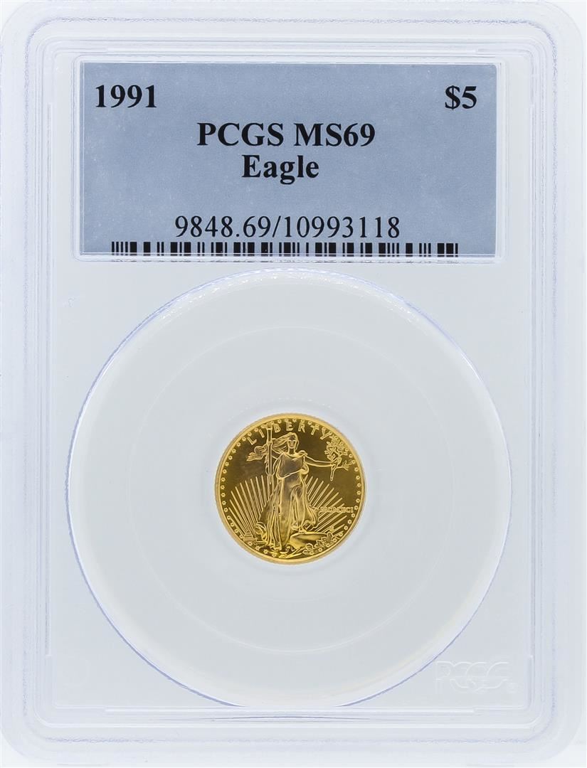 One 1991 PCGS MS69 $5 American Eagle Gold Bullion Coin. 1/10 oz. pure gold. PCGS Certified.