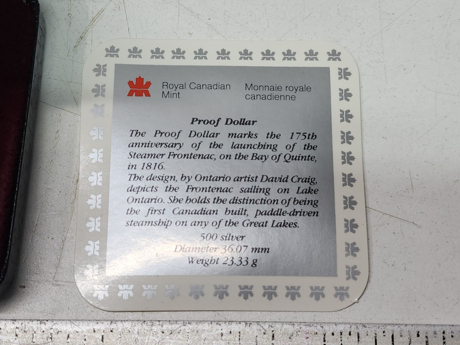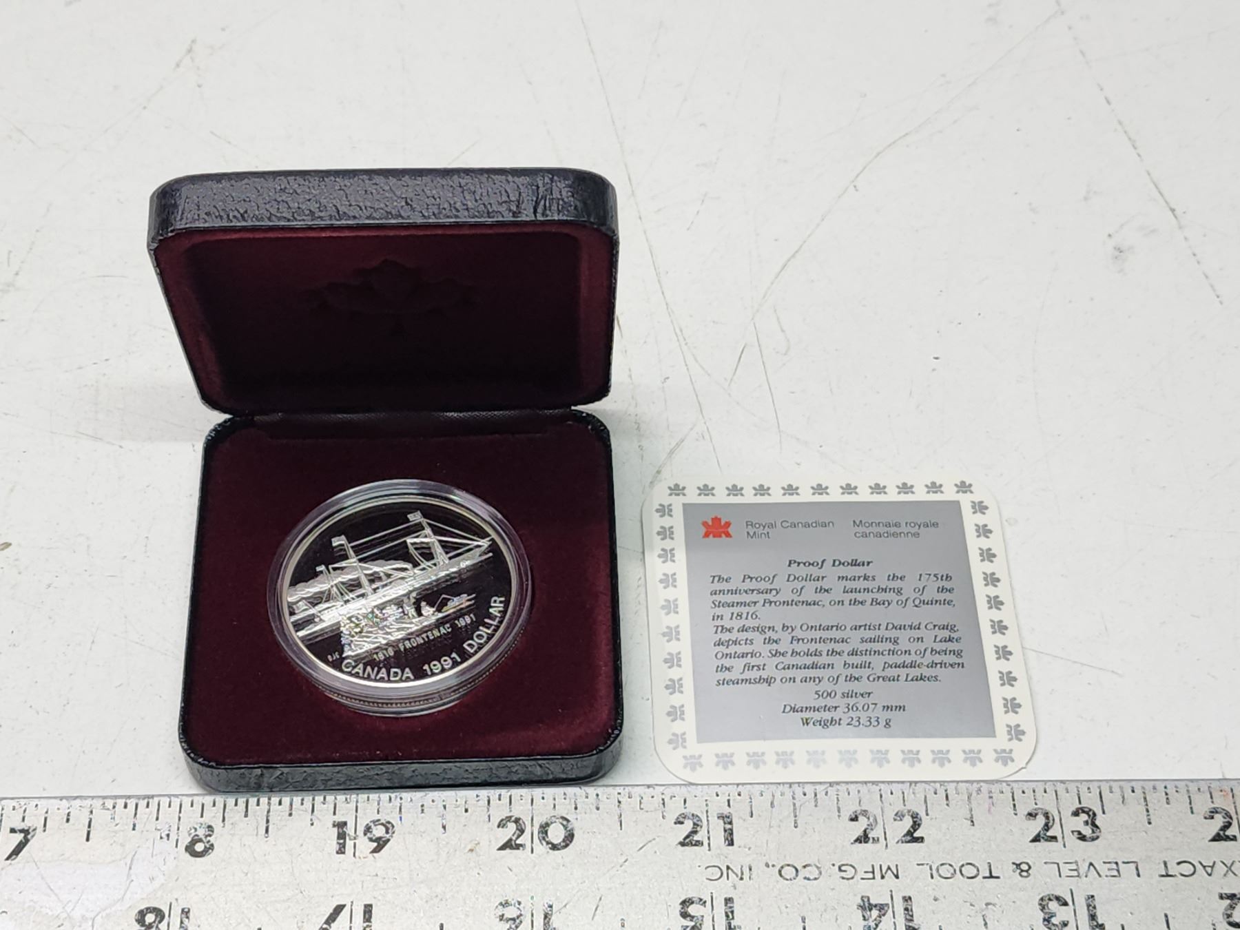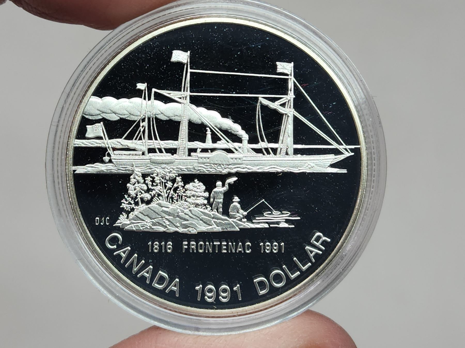 1991 Proof Silver Dollar. Commemorates the 175th Anniversary of the steamer Frontenac. Proof with Ultra Heavy Cameo. Bright White. Housed in its original Royal Canadian Mint case of issue. Includes Certificate of Authenticity.