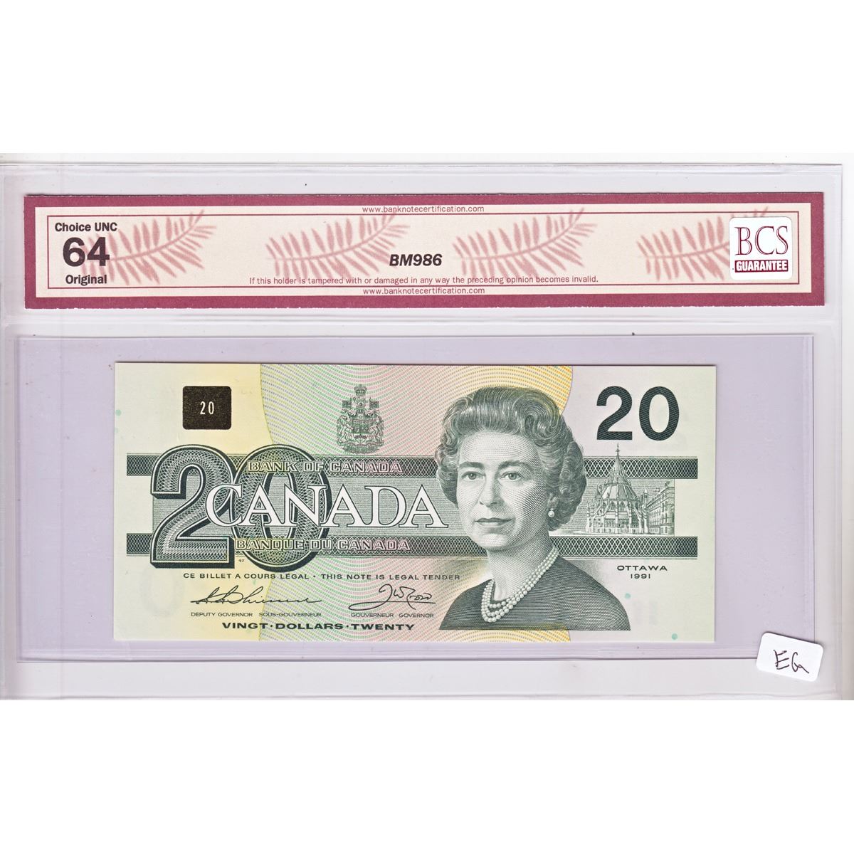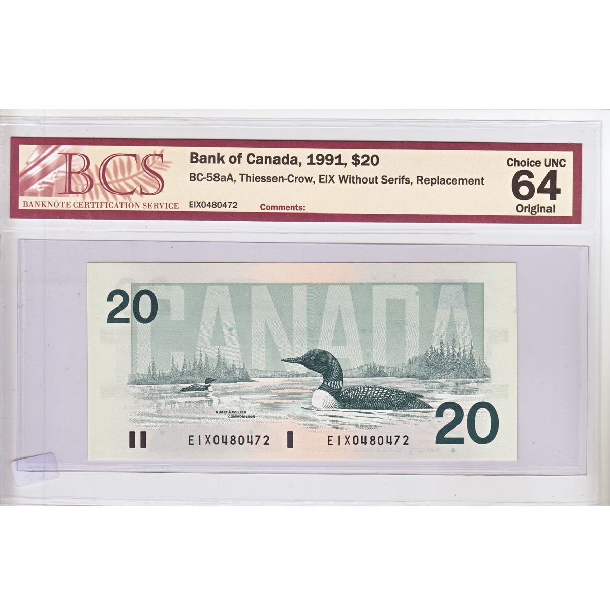 1991 Replacement $20.00 Note from the Bank of Canada; cat code BC-58aA, Thiessen-Crow signatures, Prefix EIX without Serifs, BCS Certified CUNC-64, Original. Buyers Premium will be added on all items as per our terms of sale. We accept Paypal, Credit Card, E-Transfer Payments, Cheque or Money Orders (there is an additional 3% fee for using Paypal or Credit Card). All invoices will be emailed immediately following the auction, please contact us if you would like to pay by credit card or receive a new revised lower total for mailing in payment or sending an e-transfer (3% discount). All Items Are Sold "AS IS", no returns