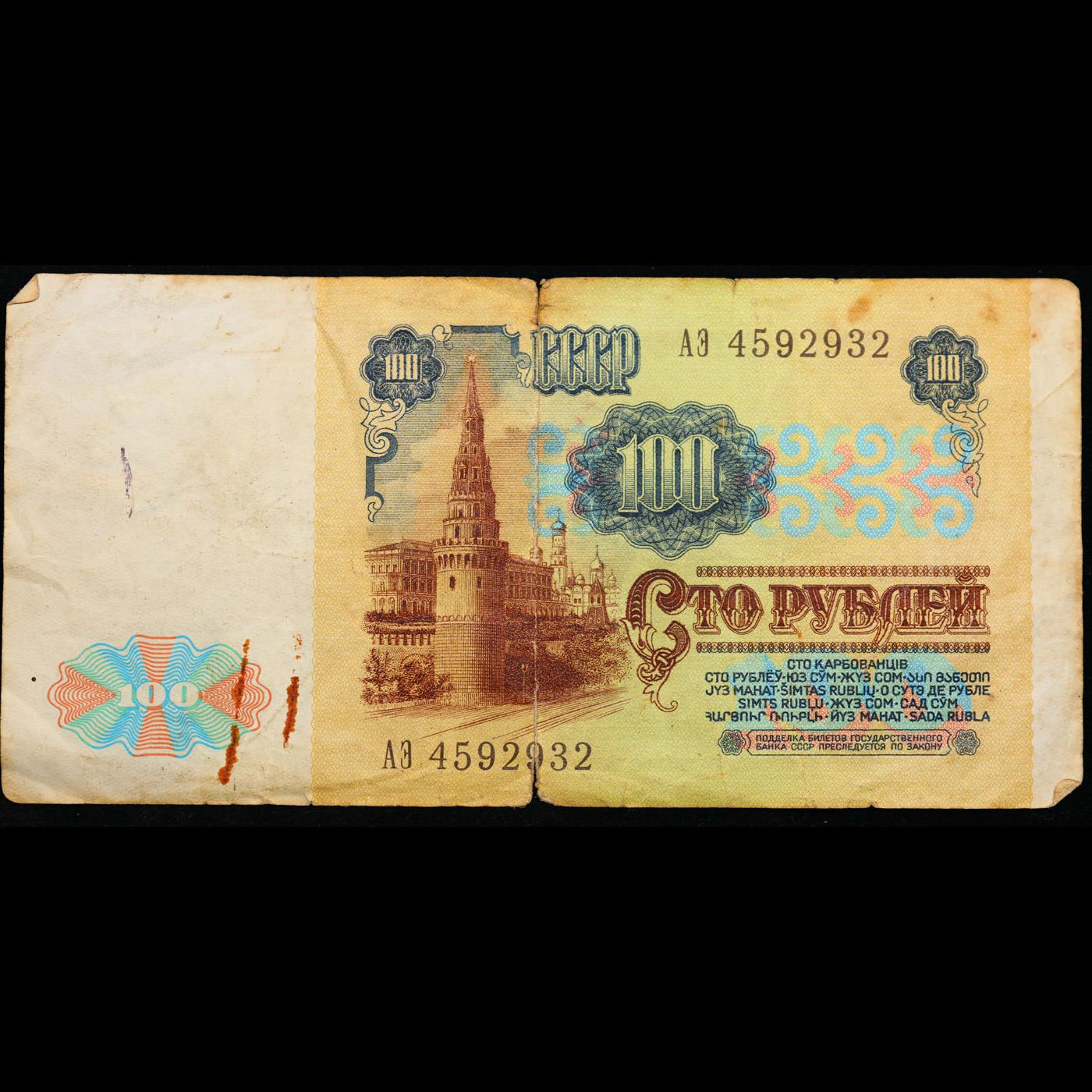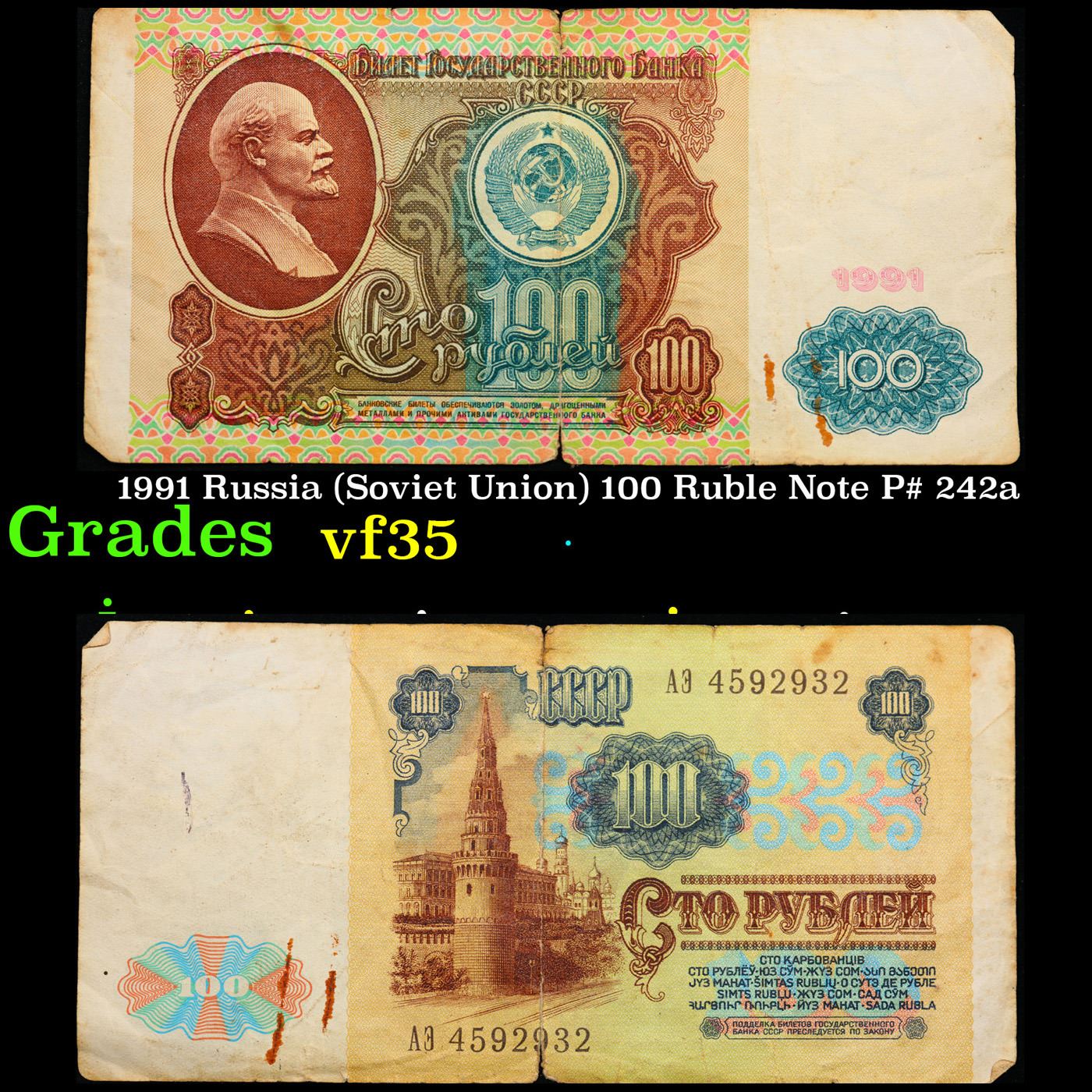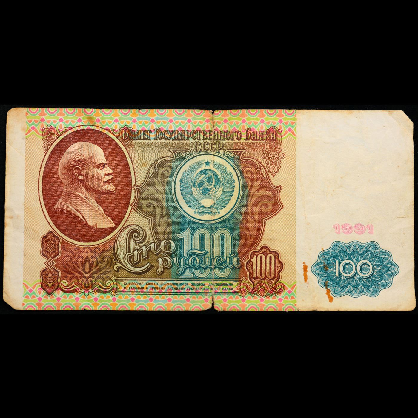 1991 Russia (Soviet Union) 100 Ruble Note P# 242a Grades vf++. The "Sixth Soviet Ruble" was issued first in 1961, and the designs for both the non-commemorative coins and paper currency of the Soviet Union almost remained identical from 1961 nearly until the fall of the Soviet Union in 1991. Briefly before the Soviet Union fell, there was the monetary reform of 1991 and the release of the Seventh Soviet Ruble, with designs that were fairly similar to the 1961 Rubles. Interestingly, the 500 Ruble note only existed for 2 days before the collapse of the Soviet Union, and the 1000 Soviet Ruble note only came into existence 3 months after the collapse of the Soviet Union. Some Soviet banknotes were printed and remained in use in various ex-Soviet states in 1992-1993, still utilizing the 1991 Soviet designs.