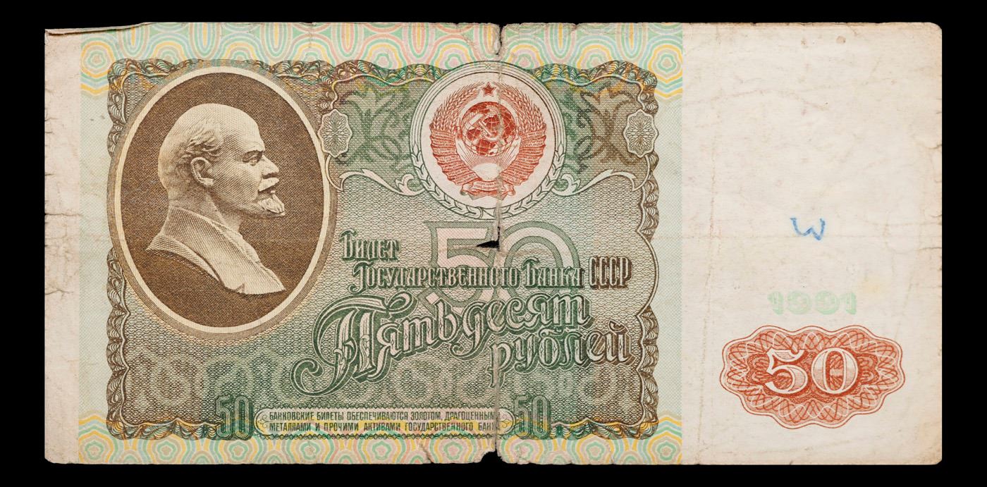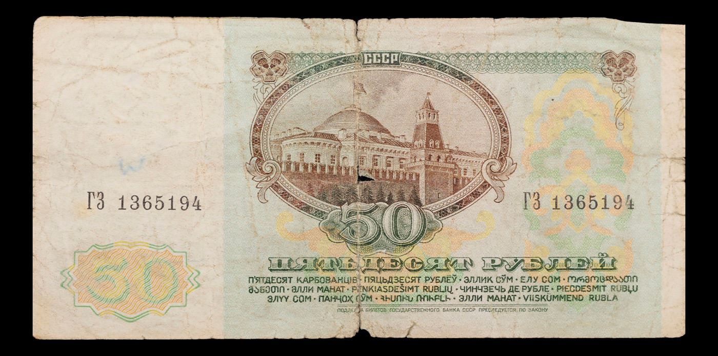 1991 Russia (Soviet Union) 50 Ruble Note Grades vf, very fine. The "Sixth Soviet Ruble" was issued first in 1961, and the designs for both the non-commemorative coins and paper currency of the Soviet Union almost remained identical from 1961 nearly until the fall of the Soviet Union in 1991. Briefly before the Soviet Union fell, there was the monetary reform of 1991 and the release of the Seventh Soviet Ruble, with designs that were fairly similar to the 1961 Rubles. Interestingly, the 500 Ruble note only existed for 2 days before the collapse of the Soviet Union, and the 1000 Soviet Ruble note only came into existence 3 months after the collapse of the Soviet Union. Some Soviet banknotes were printed and remained in use in various ex-Soviet states in 1992-1993, still utilizing the 1991 Soviet designs.