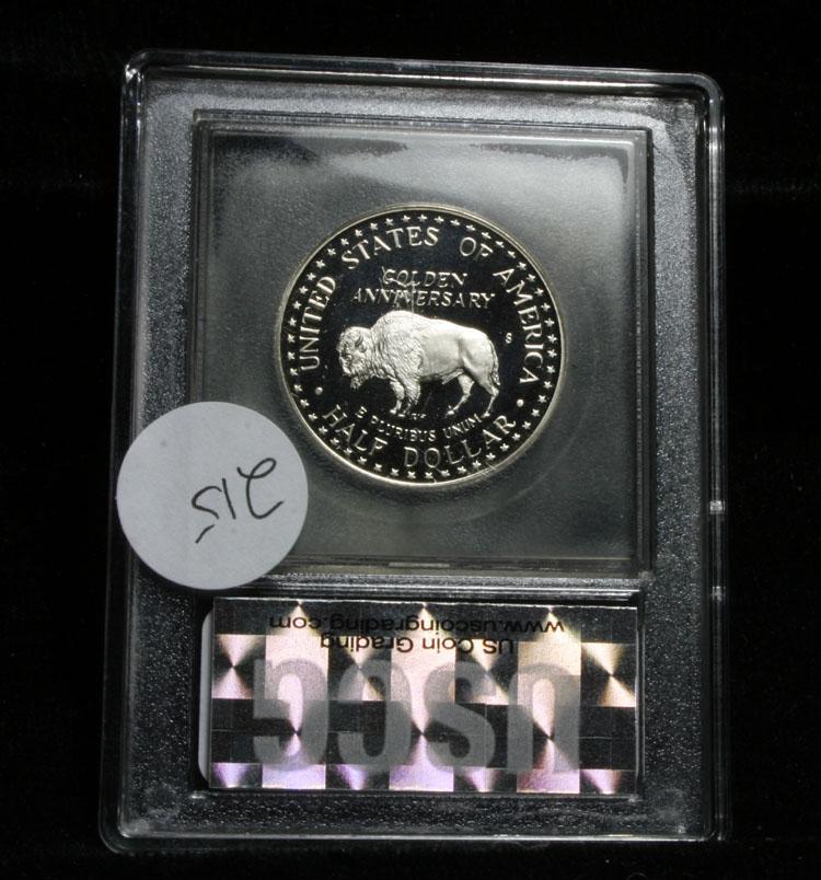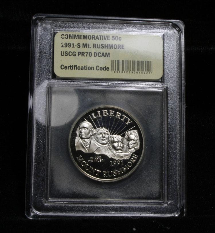 Issued to celebrate the Golden Anniversary of The completion of Mount Rushmore. PCGS lists a PR70 DCAM at $600. This coin is Graded perfect PR70 Deep Cameo by USCG. Estimated Value $125.