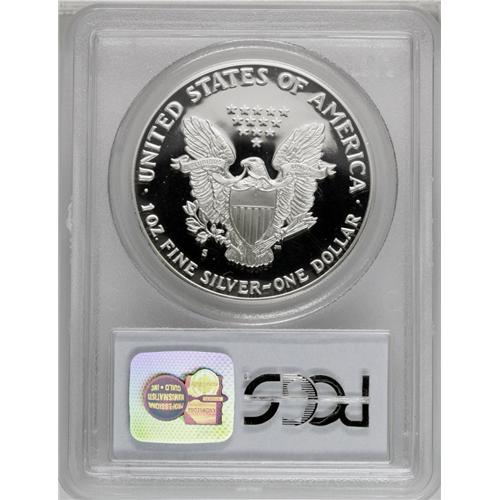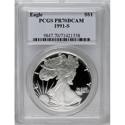 <B>1991-S<img border='0' src='http://www.heritagecoins.com/images/star.gif' width=10 height=10>$1> Silver Eagle PR70 Deep Cameo PCGS.</B></I> A perfect proof example with splendid contrast between the fields and the devices. Population: 24 in 70 (4/06).