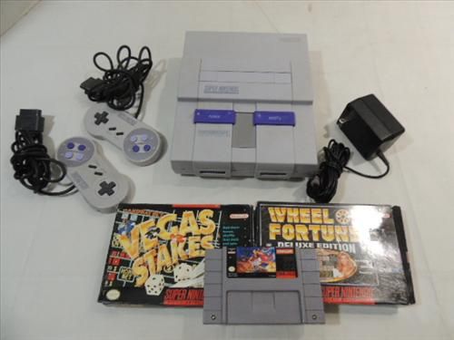 1991 SUPER NINTENDO CONSOLE, 2 CONTROLLERS, 3 GAMES: ALADIDIN, WHEEL OF FORTUNE, VEGAS STAKES. AS SHOWN. VIEW PICTURE FOR DETAIL.