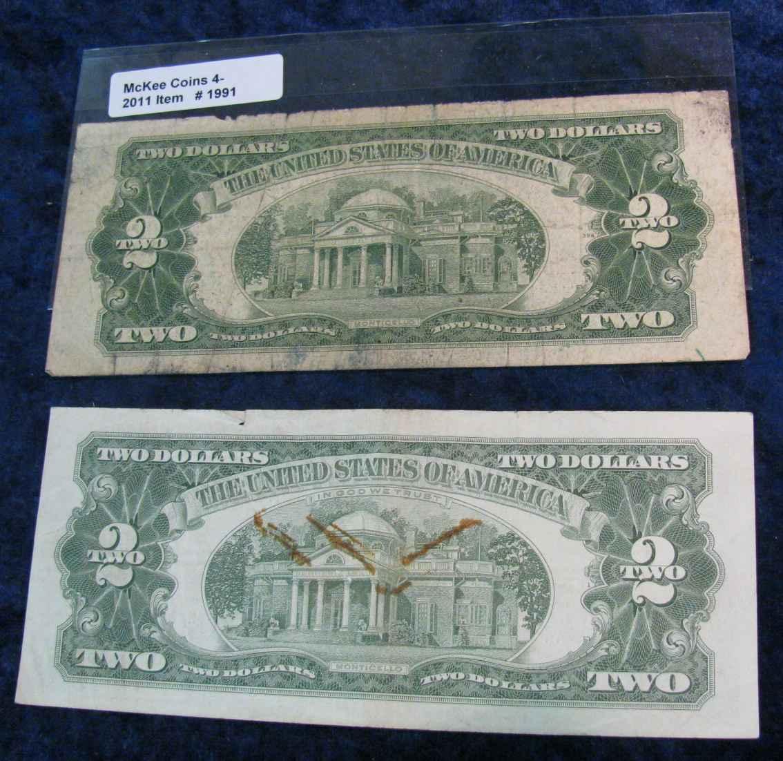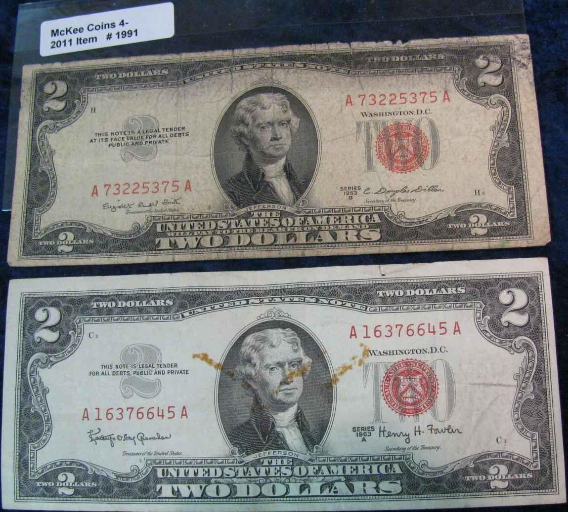 1991. Series 1953 B AG & 1963A VF with rust spots $2 U.S. Notes. Both with red seals.