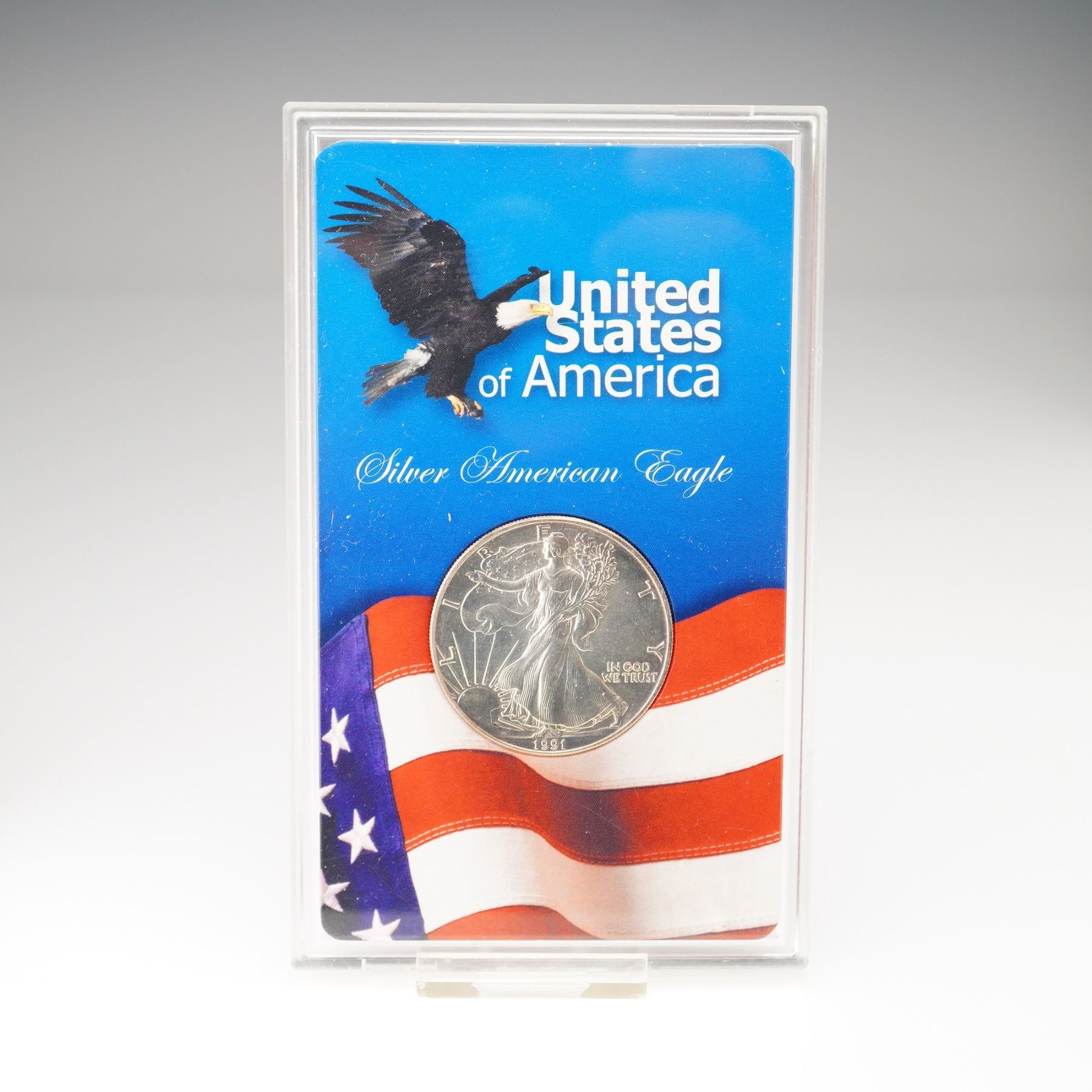 A 1991 one-ounce Silver American Eagle coin, struck in .999 fine silver and housed in its original "American Eagle Program" patriotic display packaging. The obverse features Adolph A. Weinman's iconic Walking Liberty design, while the reverse bears John Mercanti's heraldic eagle with shield. The included packaging displays a full-color card with a bald eagle, American flag, and printed specifications on the reverse (weight: 31.103 grams, diameter: 40.6 mm, fine silver content: 31.072 grams). This early-date issue remains a collector favorite from the Eagle series' initial decade.