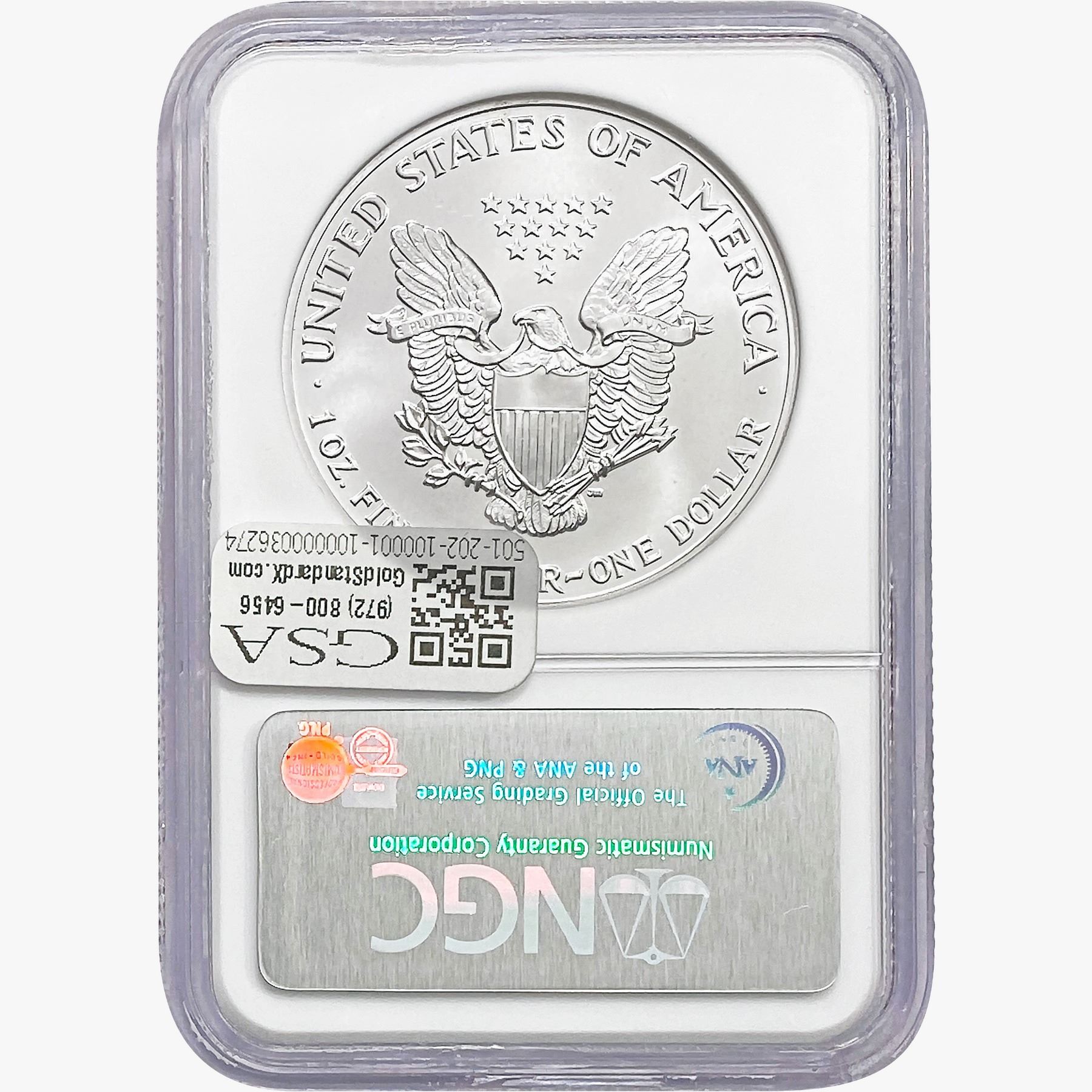 e. Coins sold referencing a third-party grading service are sold “AS IS” without any express or implied warranty, except for a guarantee by GSA that they are genuine. Removal or alteration of the holder, voids all of Bidder’s claims concerning that Product. Certain warranties may be available from the grading services and Bidders are referred to them for further details: Numismatic Guaranty Corporation (NGC), PO Box 4776, Sarasota, FL 34230, www.ngccoin.com/services/writtenguarantee.asp; Professional Coin Grading Services (PCGS), PO Box 9458, Newport Beach, CA 92658, www.pcgs.com/guarantee.html; ANACS, 6555 S. Kenton St., Ste. 303, Englewood, CO 80111; and Independent Coin Grading Co. (ICG), 7901 East Bellview, Ave., Suite 50, Englewood, CO 80111.