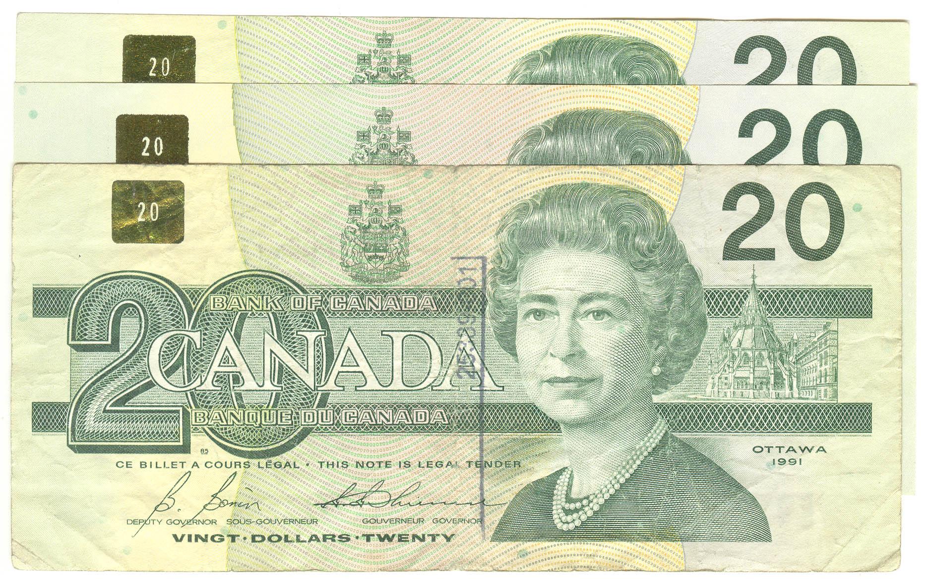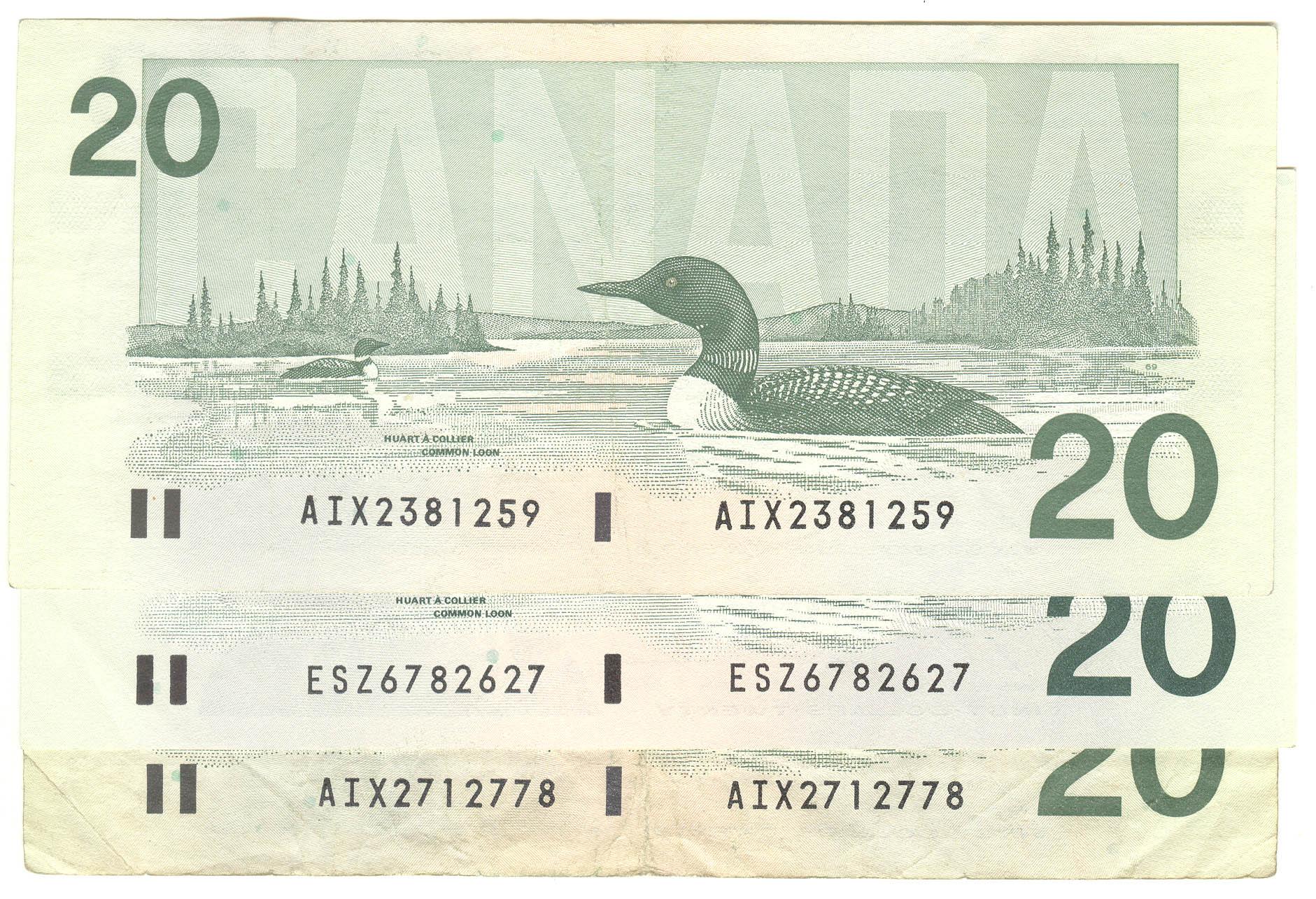 1991  Twenty Dollars  B-T Lot, BC-58b-ii, EF, Bonin Thiessen, serial ESZ6782627 no BPN, BC-58bA-i, F & VF, serial AIX2712778 & AIX2381259. Lot of 3 notes.
