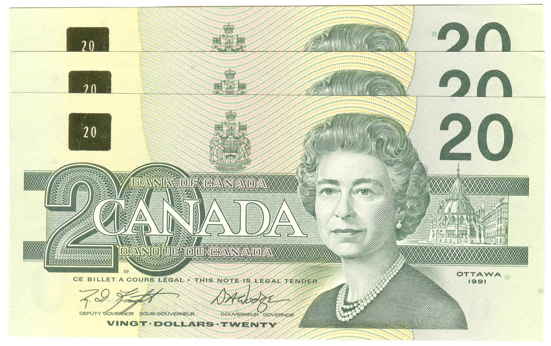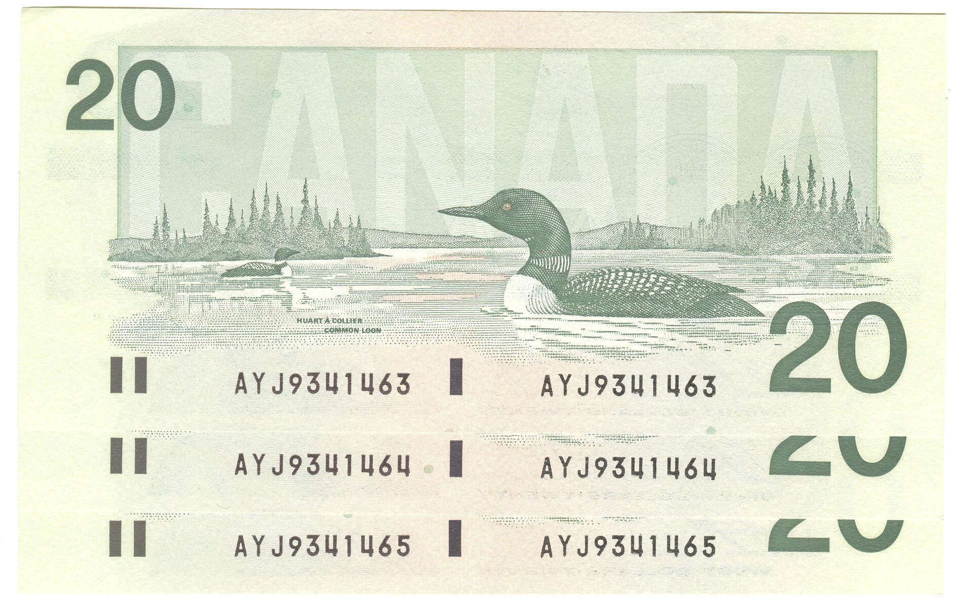 1991 Twenty Dollars, BC-58d-i, GEM UNC, Knight Dodge, serial AYJ9341463-64-65. Lot of 3 consecutive notes.