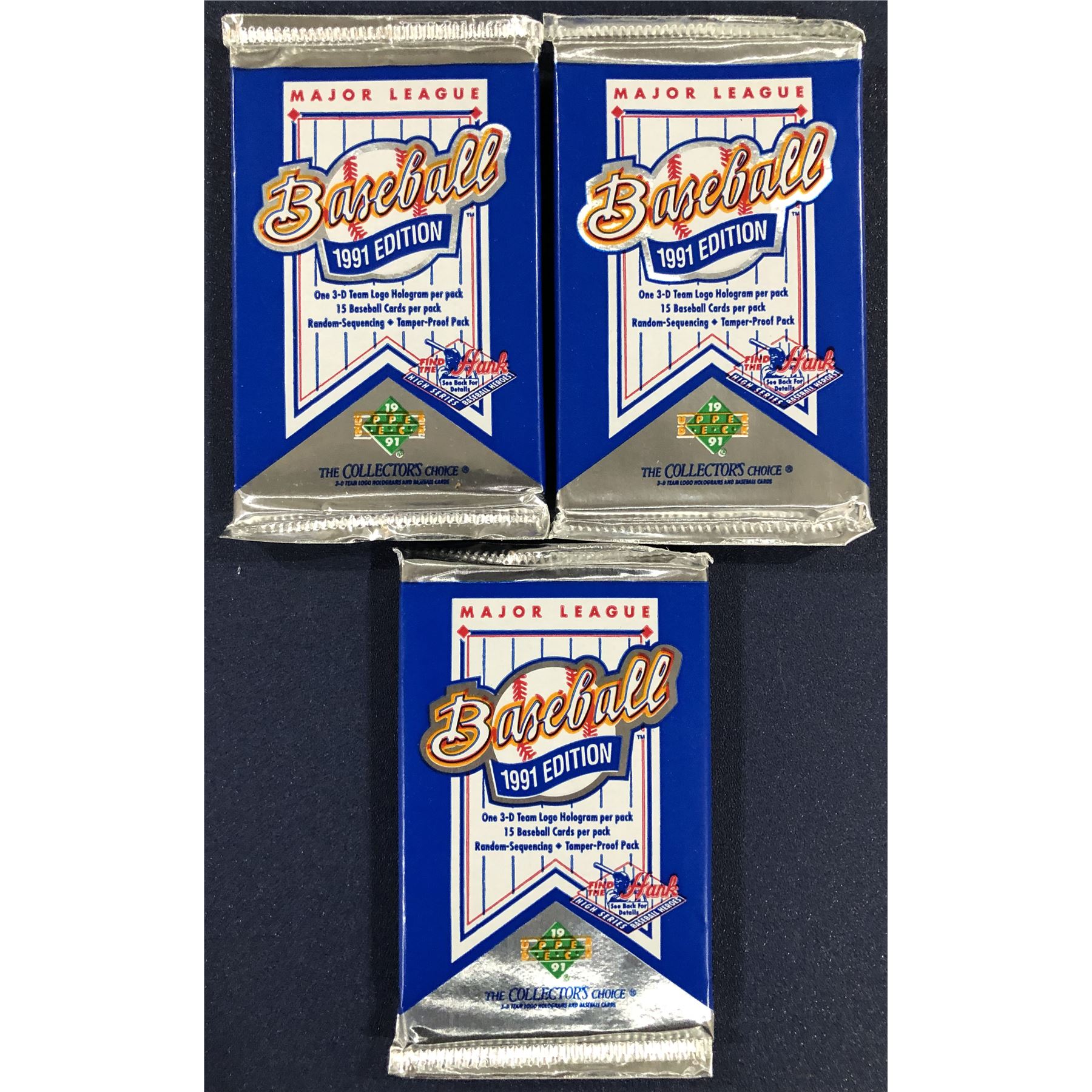 Three sealed foil packs, 15 cards plus logo hologram MLB, baseball, UD