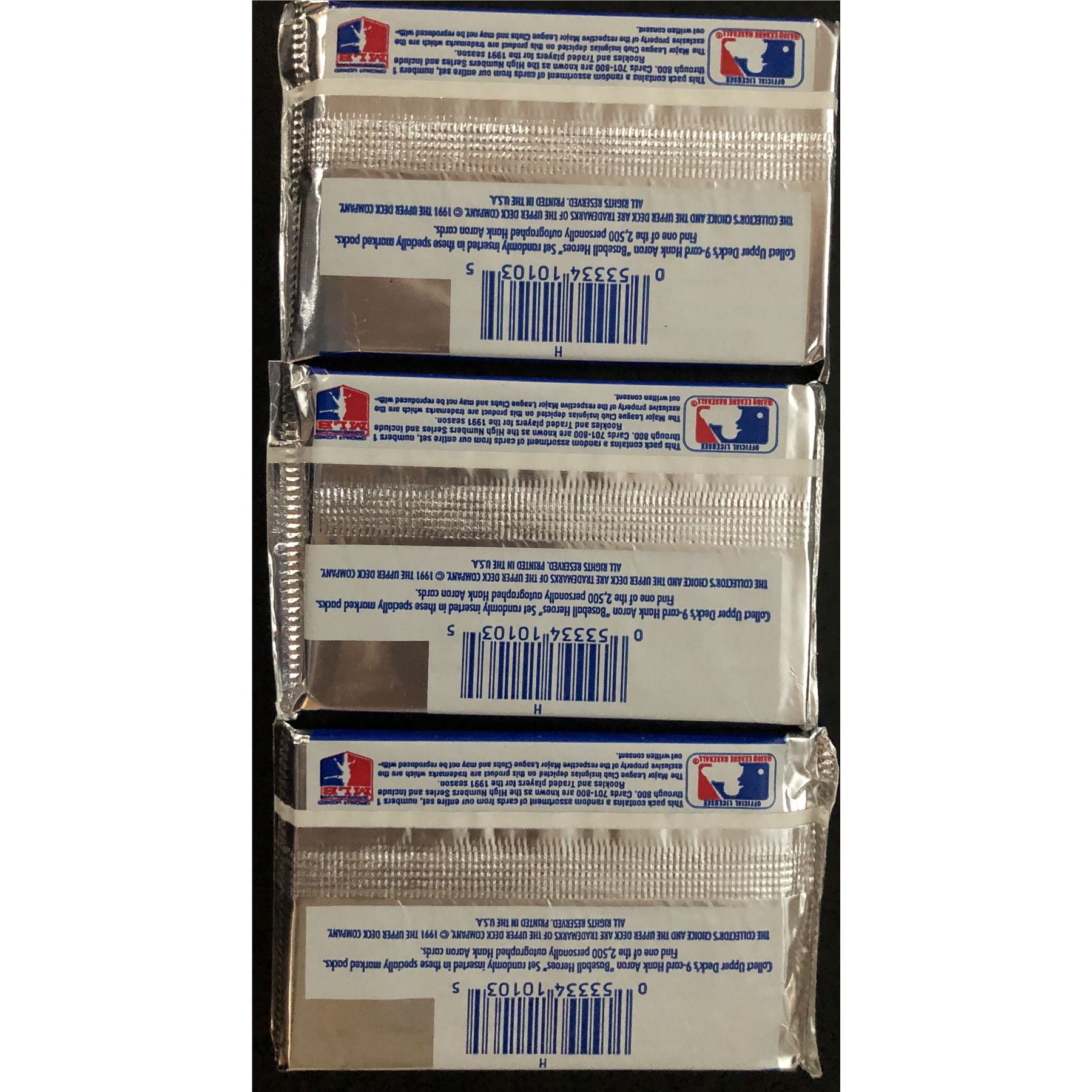 Three sealed foil packs, each containing 15 cards & 1 team hologram logo MLB, baseball, UD