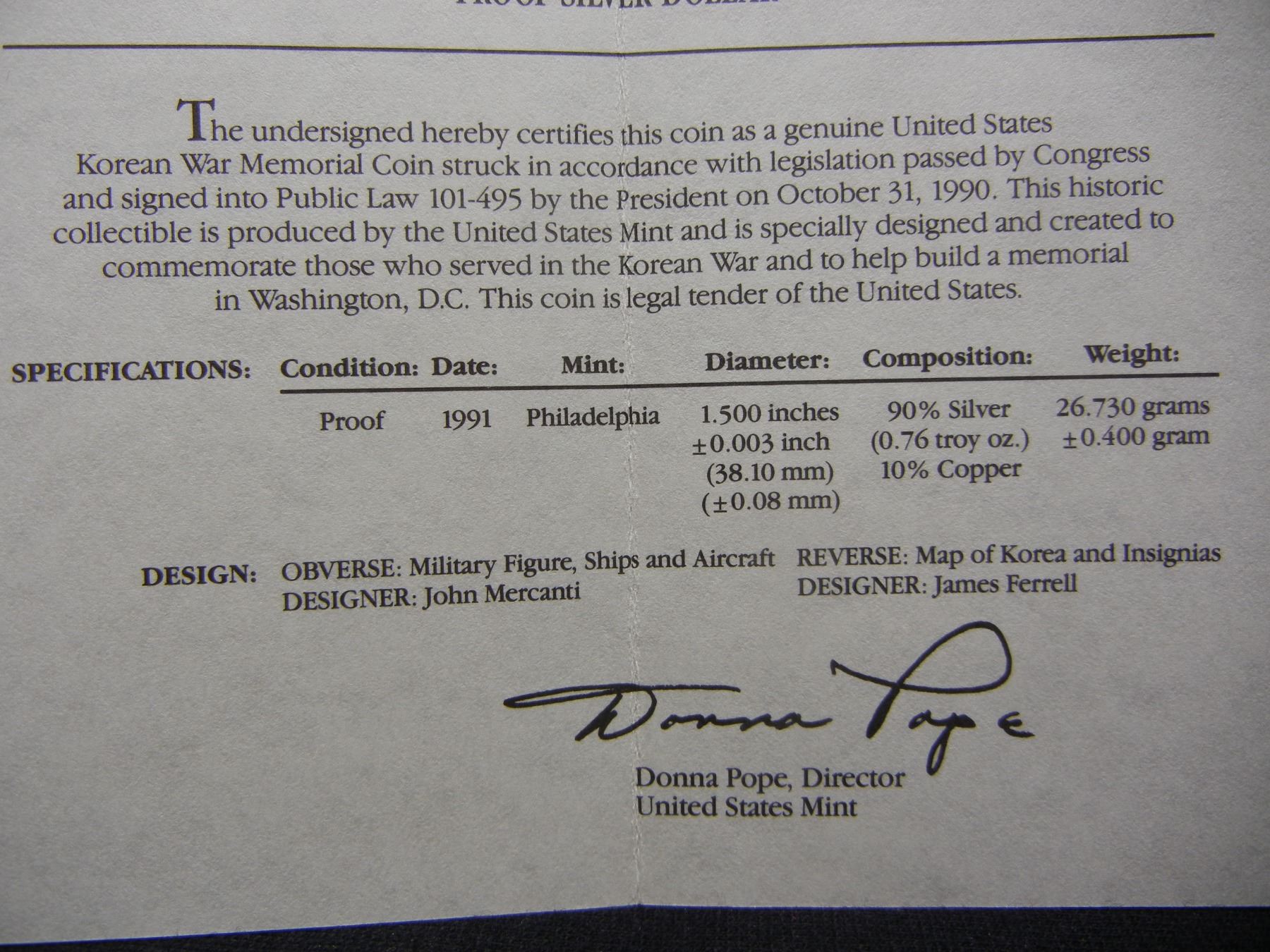 1991 US Mint Korean War $1 Proof Silver Dollar