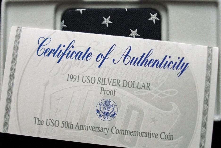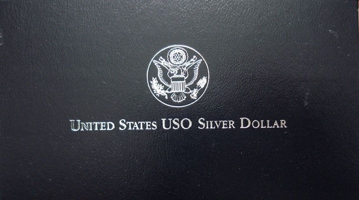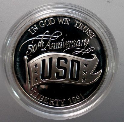 1991 USO 50th ANNIVERSARY PROOF SILVER DOLLAR. ORIGINAL MINT BOX, SLEEVE AND CERTIFICATE