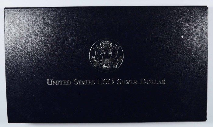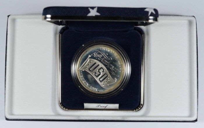 1991 USO PROOF COMMEMORATIVE SILVER DOLLAR, ORIGINAL BOX SLEEVE CERT
