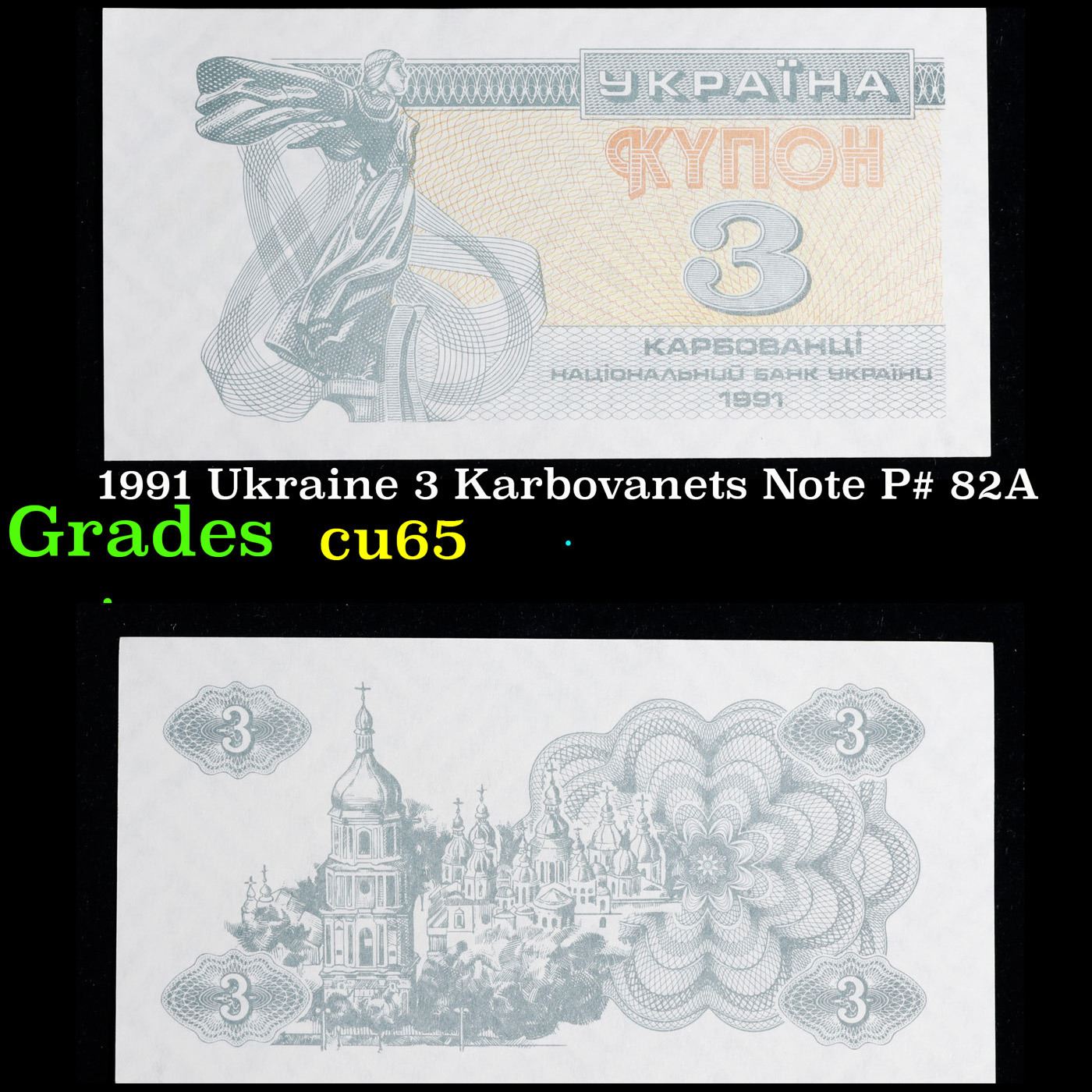 1991 Ukraine 3 Karbovanets Note P# 82A Grades Gem CU.