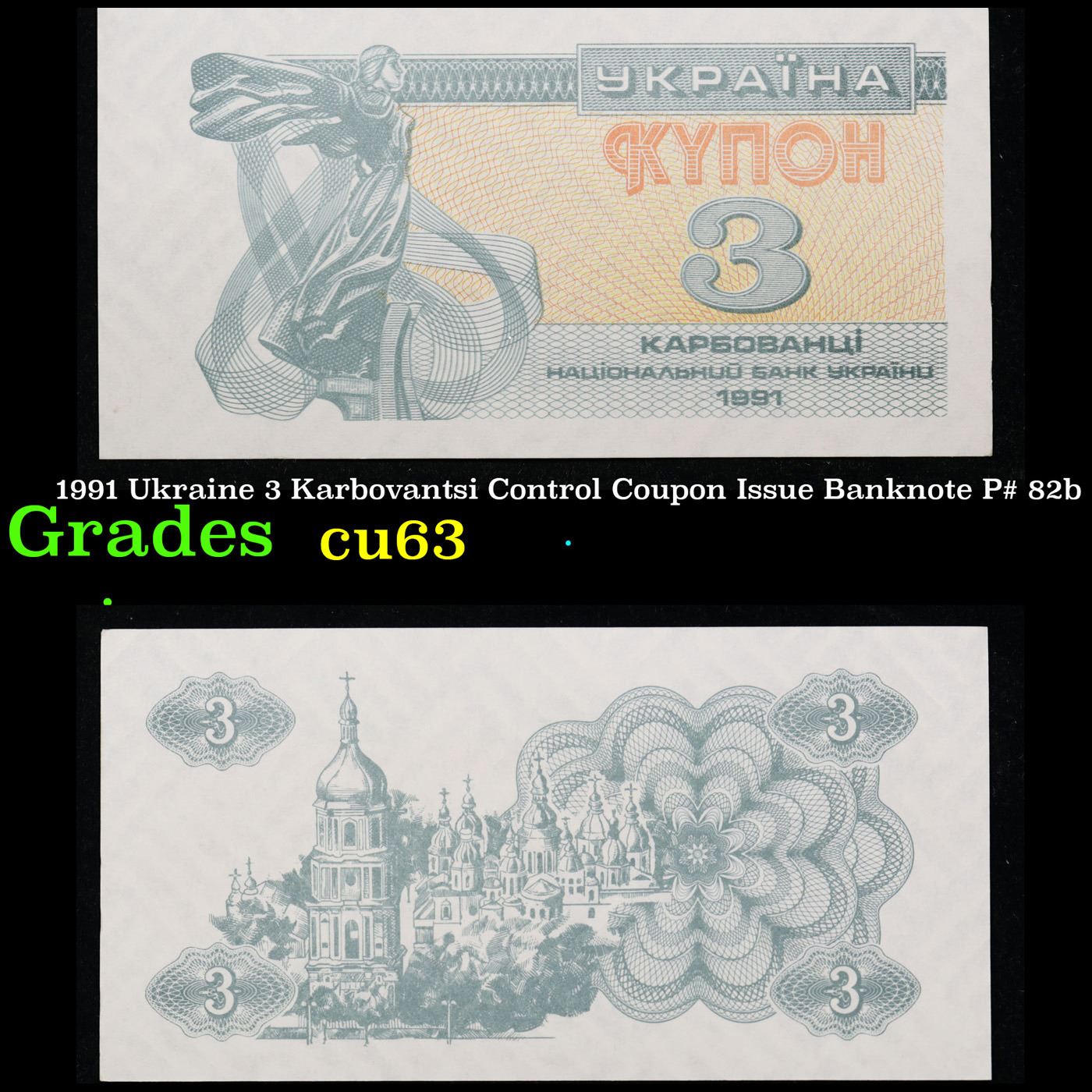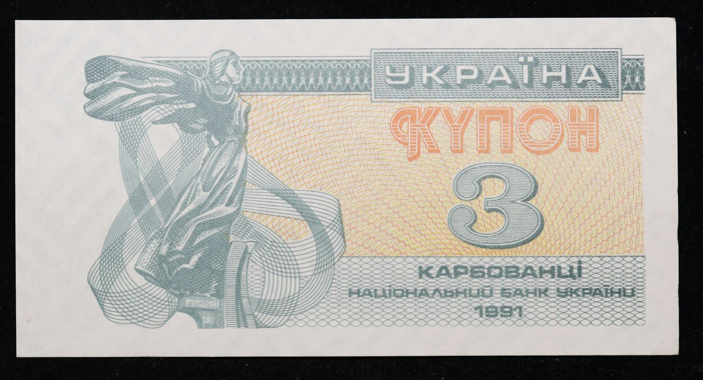 1991 Ukraine 3 Karbovantsi Control Coupon Issue Banknote P# 82b Grades Select CU. In 1991, following the collapse of the Soviet Union, Ukraine issued the Third Karbovanets. The Third Karbovanets was Ukraine's first currency issue as an independent country since the First Karbovanets of 1917, which was retired in 1920 when Ukraine became part of the Soviet Union. The Second Karbovonets was issued by the occupying German government during WWII, rather than Ukraine itself, and was pegged 10:1 to the Reichsmark. The Hryvnia replaced the Third Karbovanets as Ukraine's national currency in 1996.