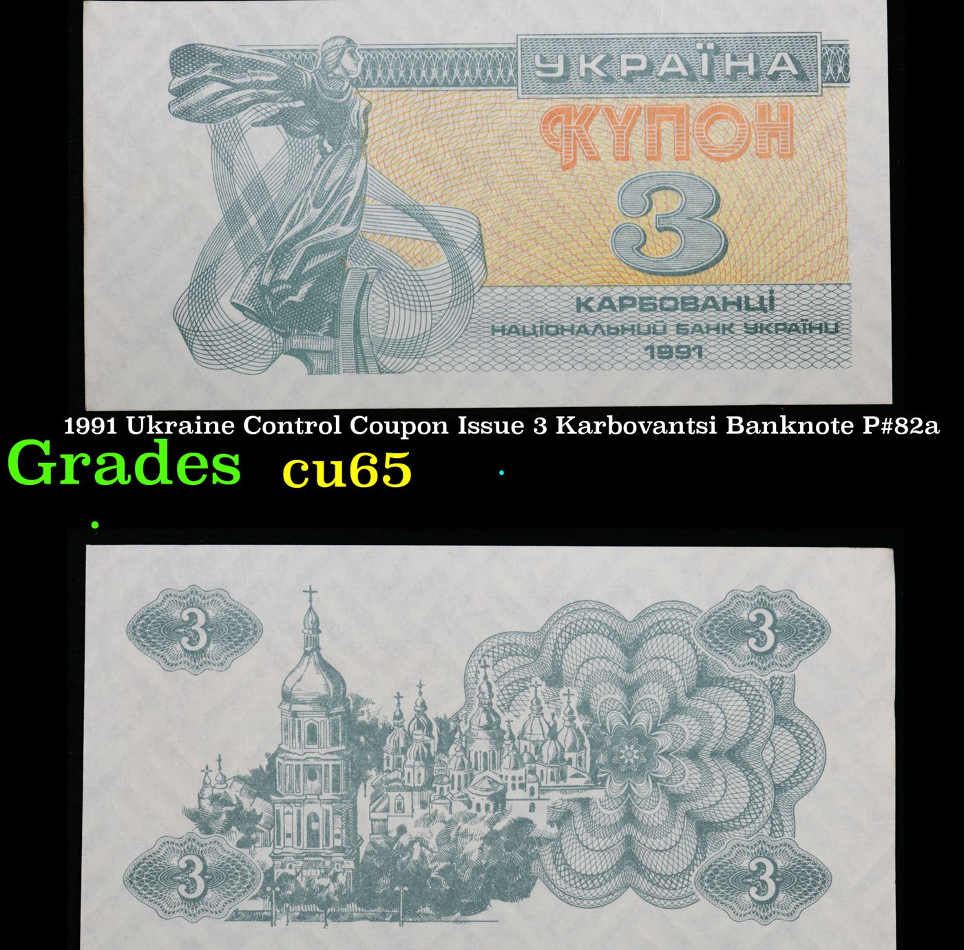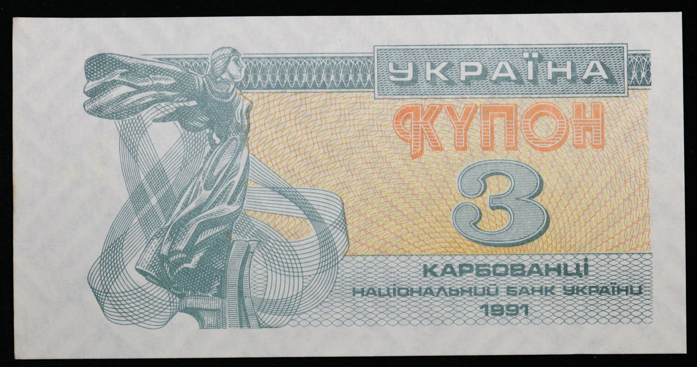 1991 Ukraine Control Coupon Issue 3 Karbovantsi Banknote P#82a Grades Gem CU. In 1991, following the collapse of the Soviet Union, Ukraine issued the Third Karbovanets. The Third Karbovanets was Ukraine's first currency issue as an independent country since the First Karbovanets of 1917, which was retired in 1920 when Ukraine became part of the Soviet Union. The Second Karbovonets was issued by the occupying German government during WWII, rather than Ukraine itself, and was pegged 10:1 to the Reichsmark. The Hryvnia replaced the Third Karbovanets as Ukraine's national currency in 1996.