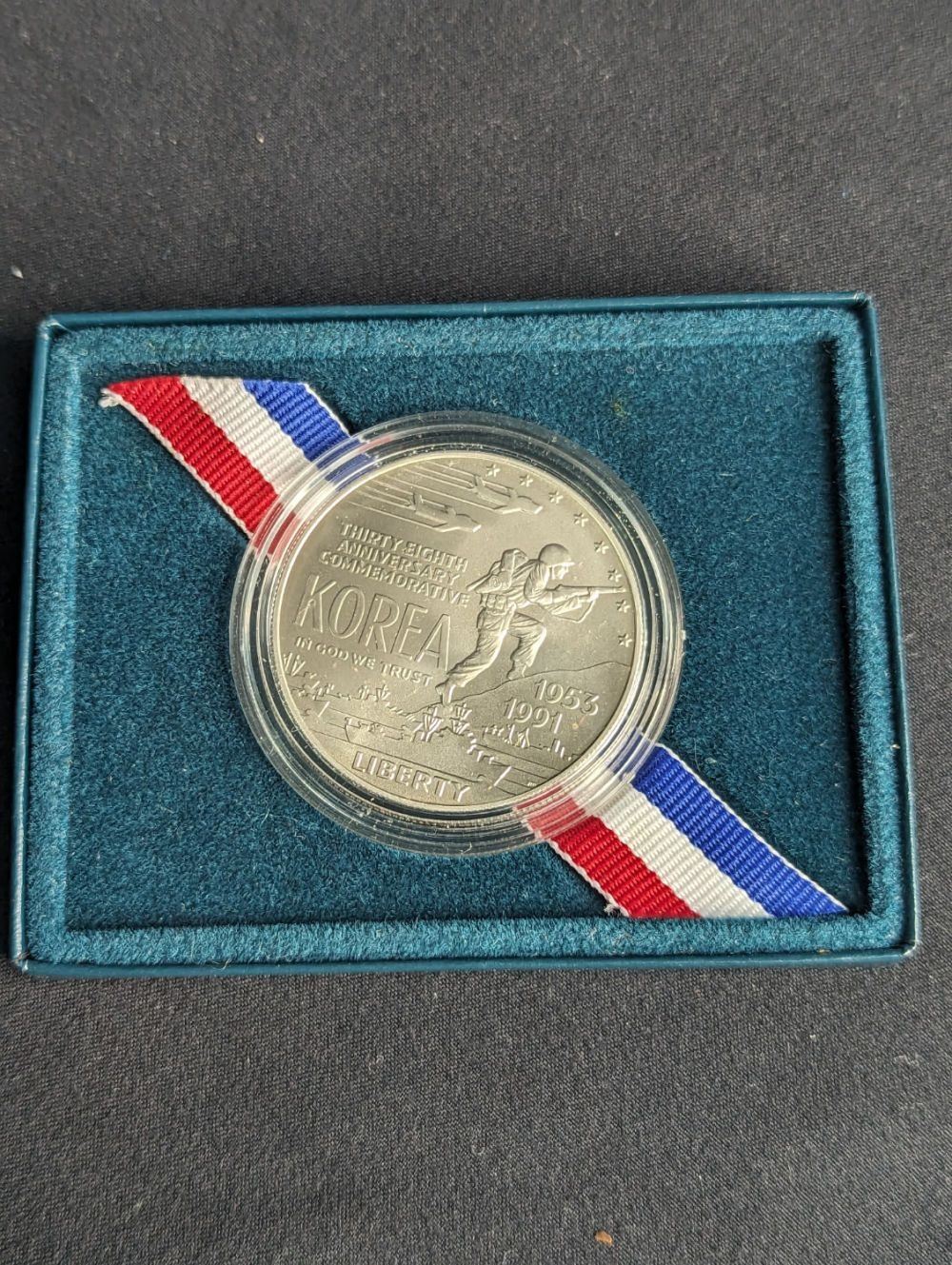 A 1991 Unc US Commemorative Silver Dollar Korean War Memorial In Box With Certificate of Authenticity. A popular issue!