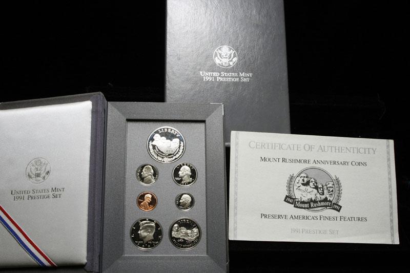 Contains the 1991 Mount Rushmore 90% silver US Silver Dollar & the 1991 Mount Rushmore Half Dollar plus the Traditional 5 pieces 1991 Proof Set. Includes all the original packaging and the COA. Note* The silver Dollar alone has .7736 Oz. of pure silver. Estimated Value $90