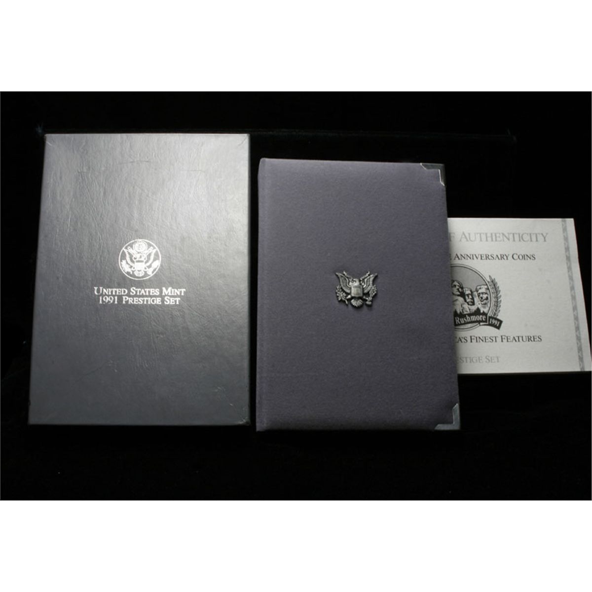 Contains the 1991 Mount Rushmore 90% silver US Silver Dollar & the 1991 Mount Rushmore Half Dollar plus the Traditional 5 pieces 1991 Proof Set. Includes all the original packaging and the COA. Note* The silver Dollar alone has .7736 Oz. of pure silver. Estimated Value $90