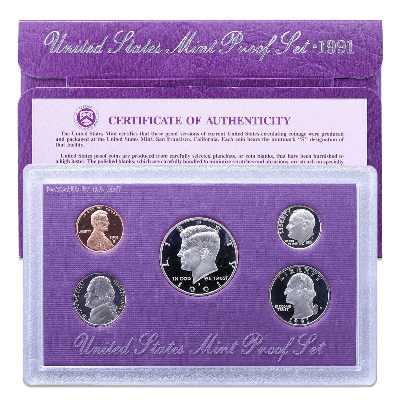 1991 United States Proof Set, 5 Coins Inside!. Original packaging: The coins of the 1991-S Proof Set were placed in individual holes in a purple-colored, textured paper and cardboard insert, then sealed in a two-piece, clear plastic case. The case was then inserted into a protective outer cover, consisting of purple cardboard, imprinted with the somewhat confusing silver words: "United States Mint Proof Set • 1991." The new collector might ask, "Is this a Mint Set or a Proof Set?"