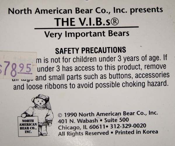 1991 Very Important Bears Bearlie Chaplin Stuffed Bear, Very Important Bears Bearlie Chaplin (Charlie Chaplin) Stuffed Bear, comes with original tag, measures 22''L x 14.5''W, Introduced in Spring of 1991 and Retired in the Spring of 1995, FYI: ''Odl Bauer, who sewed the first bear, joined Paul and Barbara Isenberg and together they worked on developing the VIB's (Very Important Bears). Using her English literature background, Barbara experimented with a variety of names and puns for these colorful 20'' velour bears. The VIB's are all retired and often increase dramatically in value on the secondary market.''