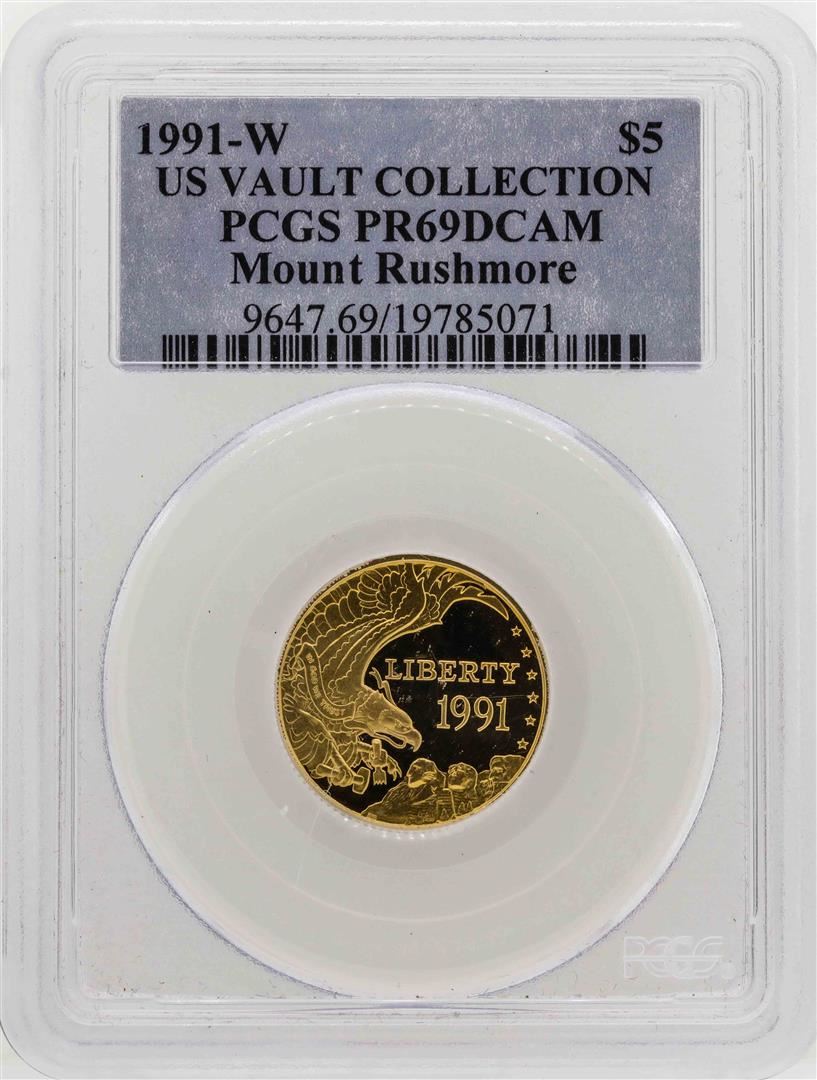 One 1991-W $5 US Vault Collection Mount Rushmore Proof Gold Coin PCGS PR69DCAM. PCGS Graded.