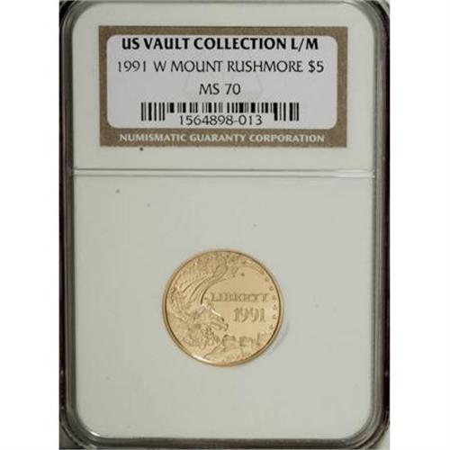 <B>1991-W G$5 Mount Rushmore Gold Five Dollar MS70 NGC. </B></I> Ex: US Vault Collection L/M. NGC Census: (761/0). PCGS Population (142/0). Mintage: 31,959. Numismedia Wsl. Price for NGC/PCGS coin in MS70: $290. (#9646)<BR><BR><b>Shipping:</b> Coins & Currency (<a target="_blank" href="http://www.heritageauctions.com/common/shipping.php">view shipping information</a>)