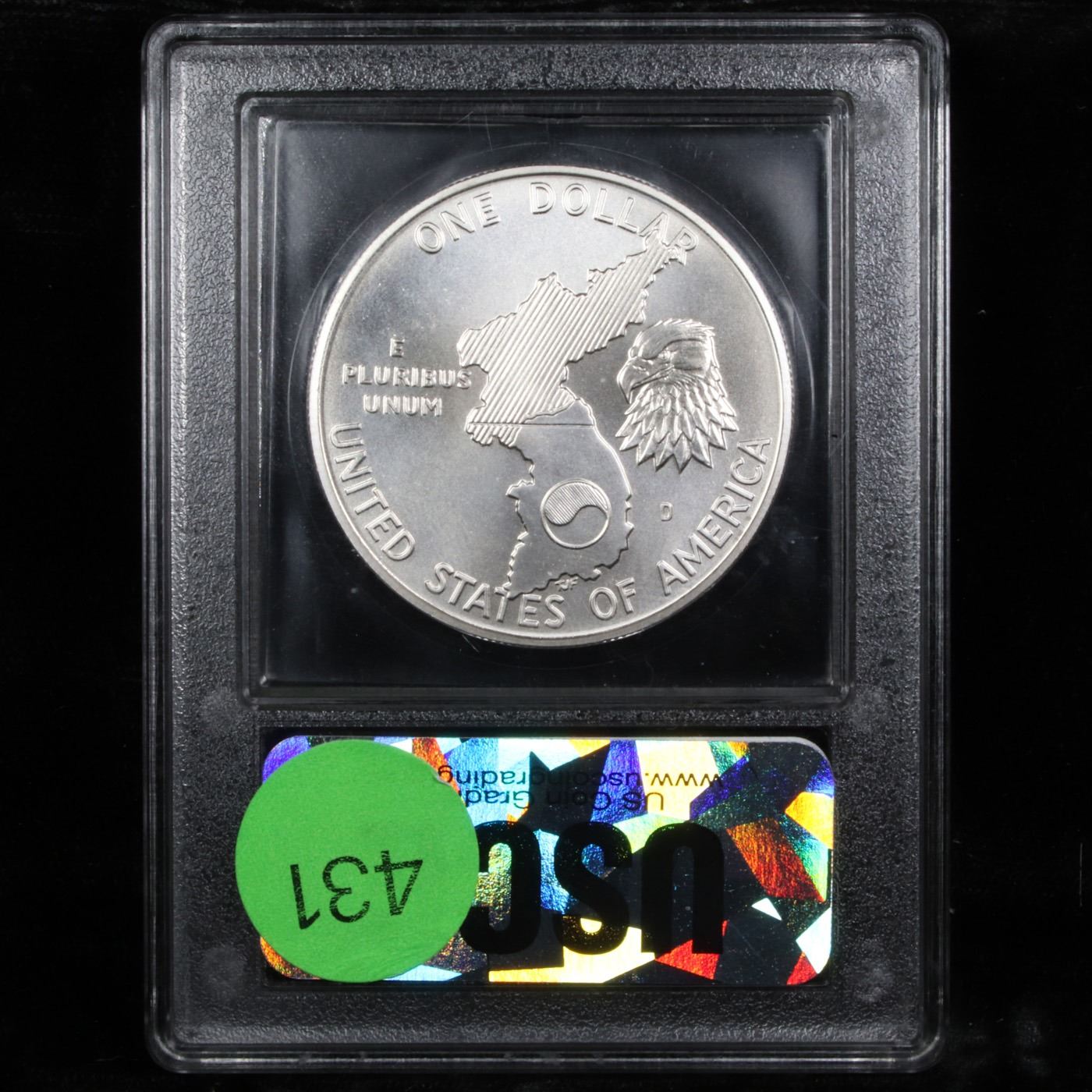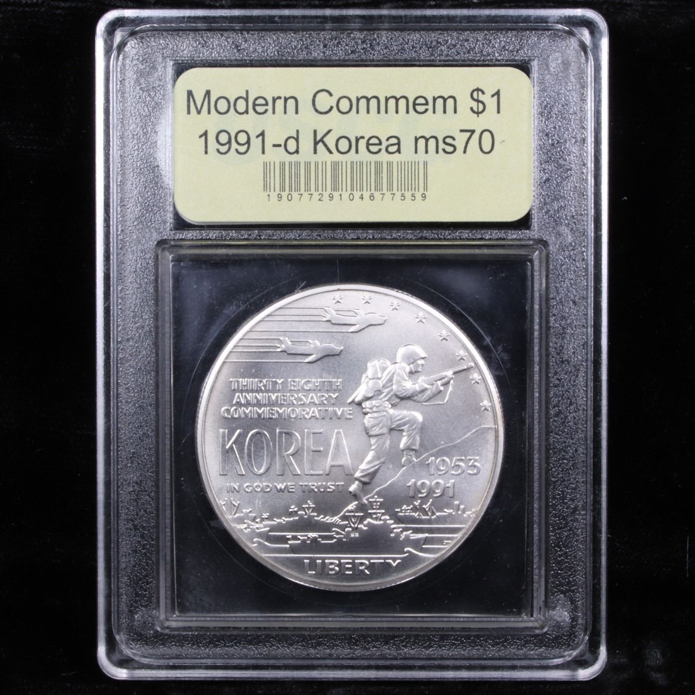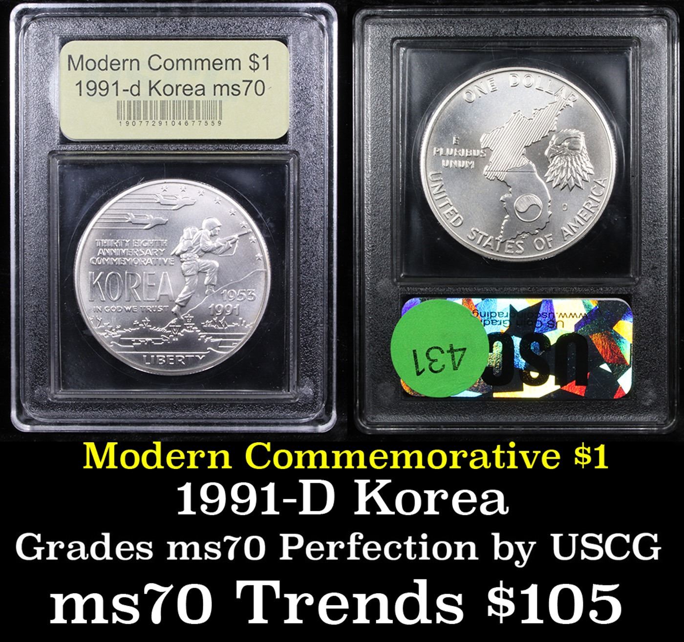 1991-d Korean War Modern Commem Dollar $1 Graded ms70, Perfection By USCG. The 1991 Korean War Memorial Silver Dollar was issued for the 38th anniversary of the Korean War. The oddly chosen anniversary date is the result of the division between North and South Korea at the 38th degree of latitude. This example was graded ms70 by USCG.