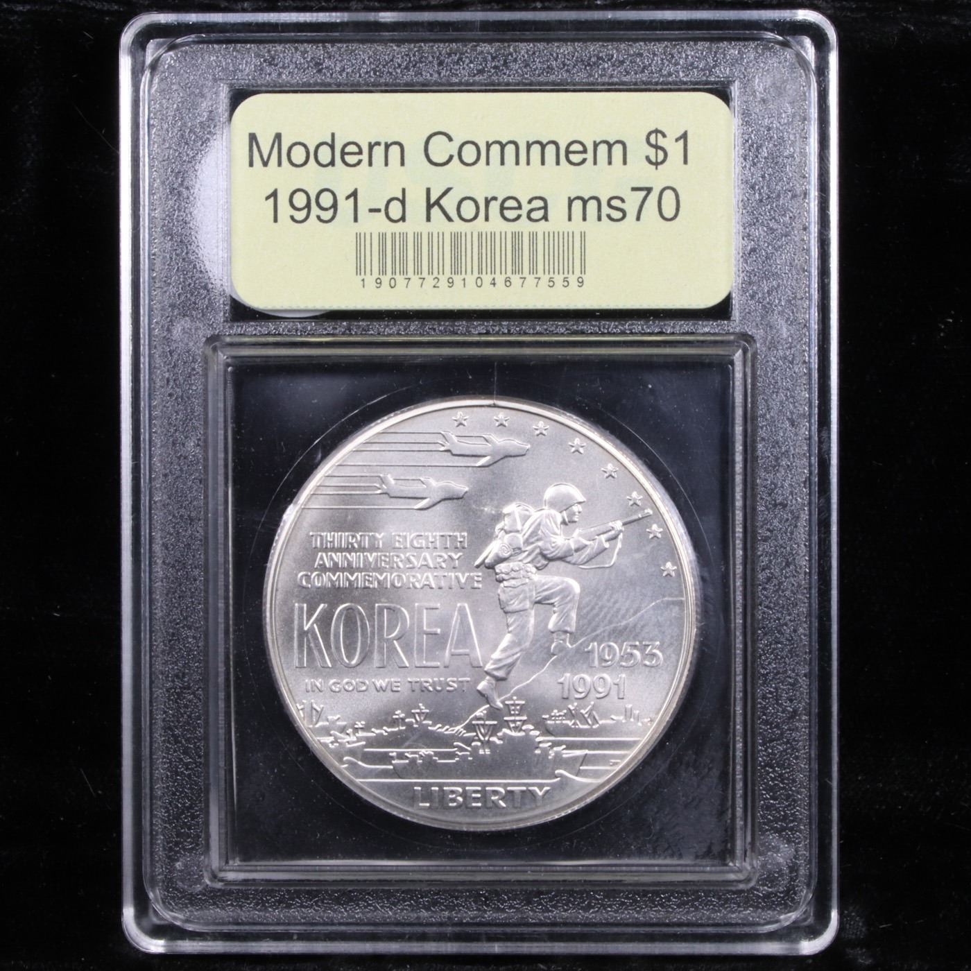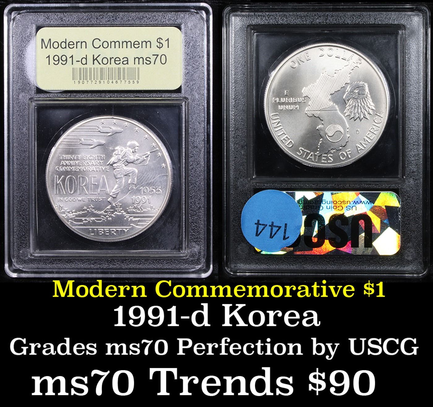 1991-d Korean War Modern Commem Dollar $1 Graded ms70, Perfection By USCG. The 1991 Korean War Memorial Silver Dollar was issued for the 38th anniversary of the Korean War. The oddly chosen anniversary date is the result of the division between North and South Korea at the 38th degree of latitude. This example was graded ms70 by USCG.