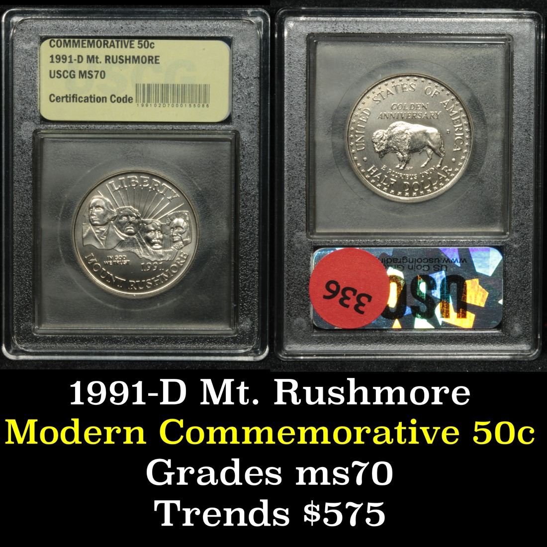 1991-d Mount Rushmore . . Modern Commem Half Dollar 50c Graded ms70, Perfection By USCG. Issued to celebrate the Golden Anniversary of The completion of Mount Rushmore. This coin is Graded perfection Gem+++ Uncirculated by USCG.