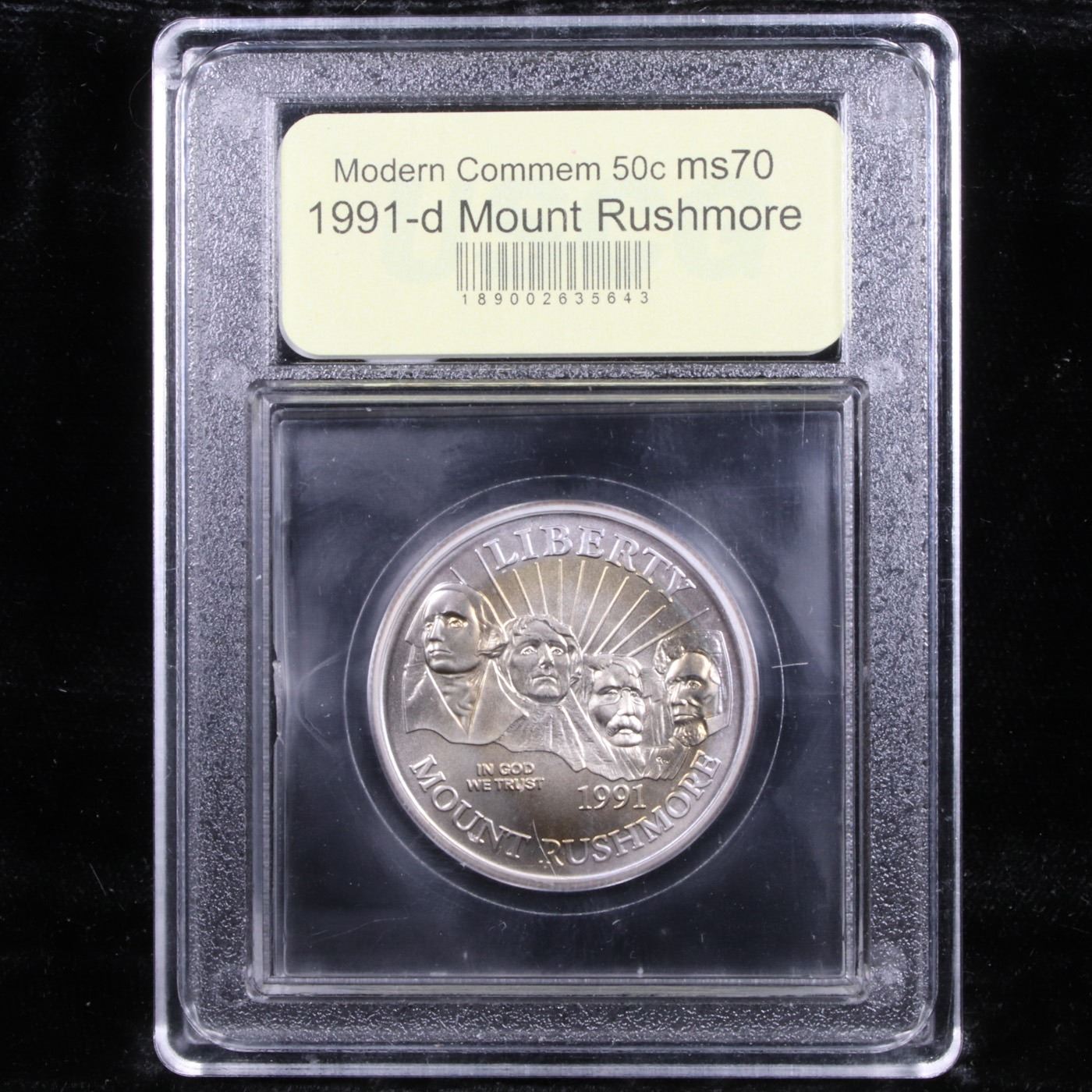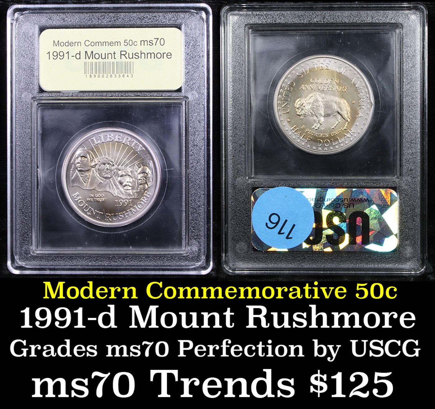 1991-d Mount Rushmore Modern Commem Half Dollar 50c Graded ms70, Perfection By USCG. 0 Issued to celebrate the Golden Anniversary of The completion of Mount Rushmore. PCGS lists an ms70 at $3300. Very scarce. This coin is Graded perfect ms70 by USCG. .