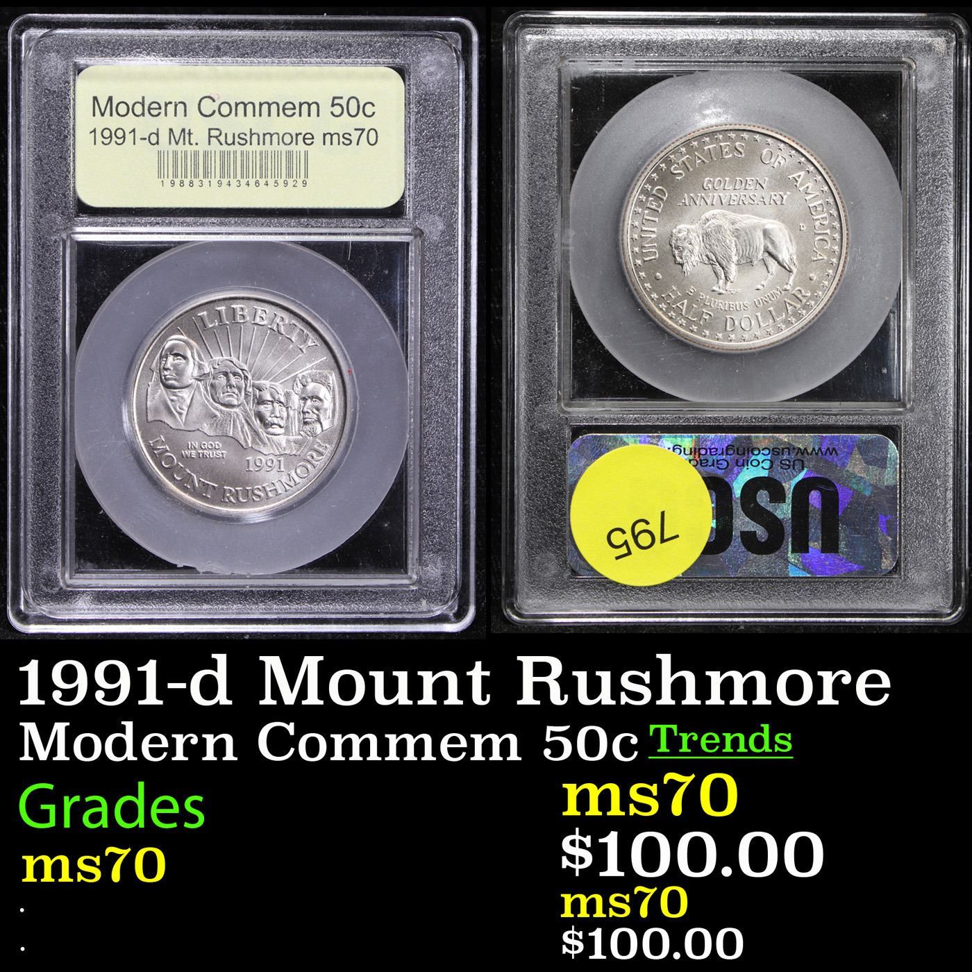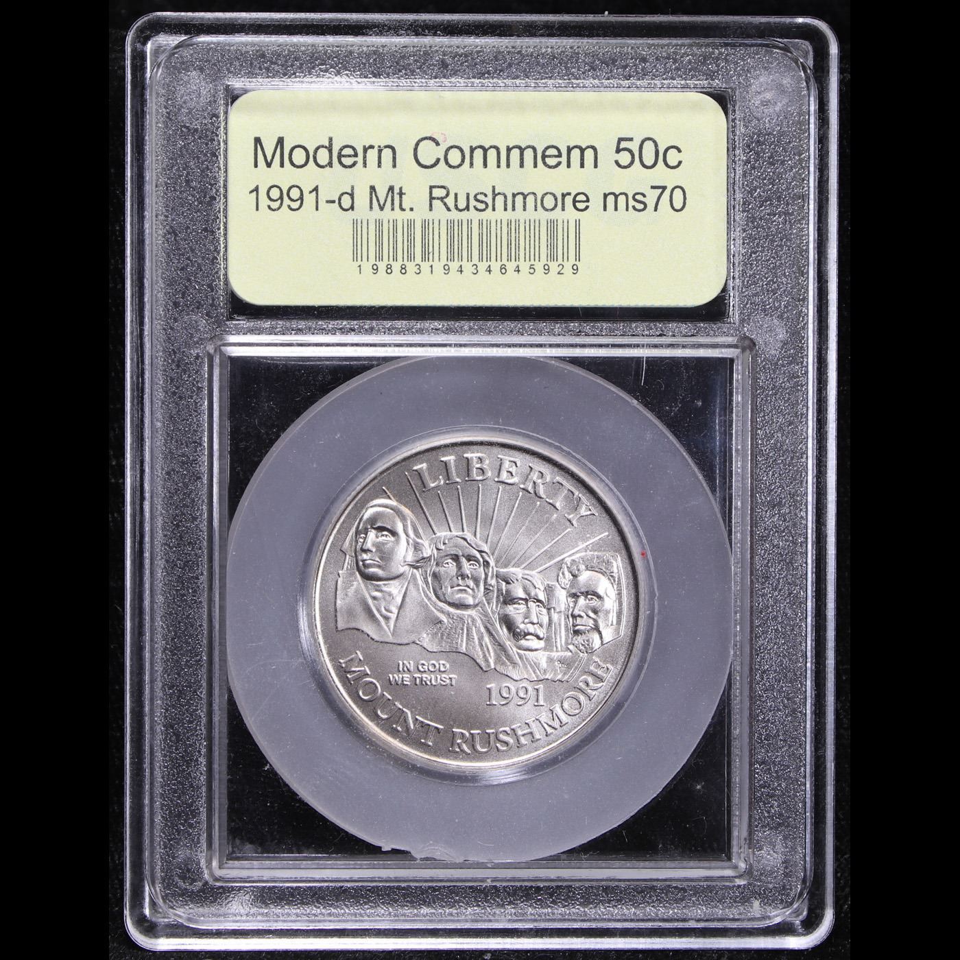 1991-d Mount Rushmore Modern Commem Half Dollar 50c Graded ms70, Perfection By USCG. Issued to celebrate the Golden Anniversary of The completion of Mount Rushmore. Trends lists at $525. This coin is Graded perfection Gem+++ Unc by USCG.