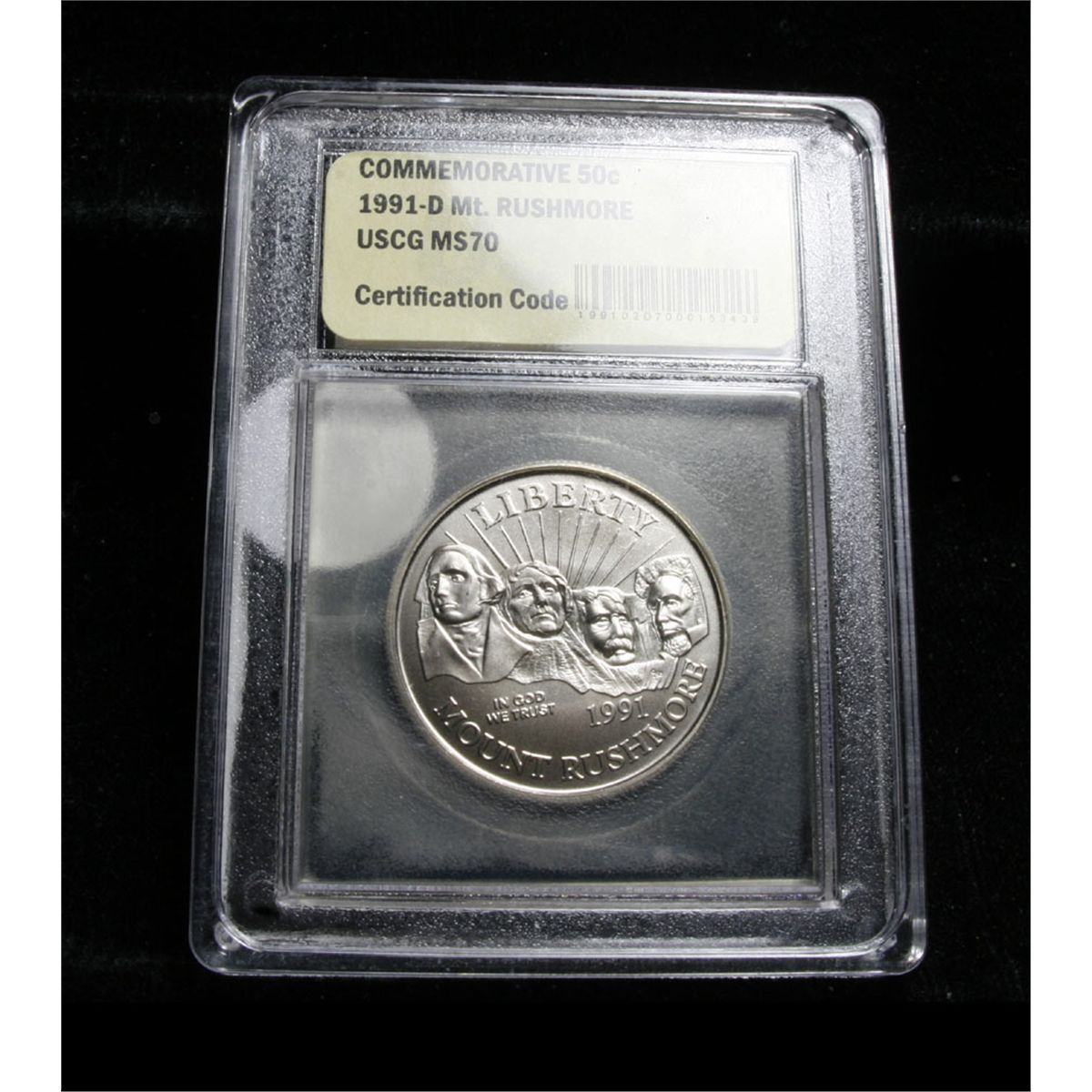 Issued to celebrate the Golden Anniversary of The completion of Mount Rushmore. PCGS lists an ms70 at $3300 WOW!!. This coin is Graded perfect ms70 by USCG. Estimated Value $300.