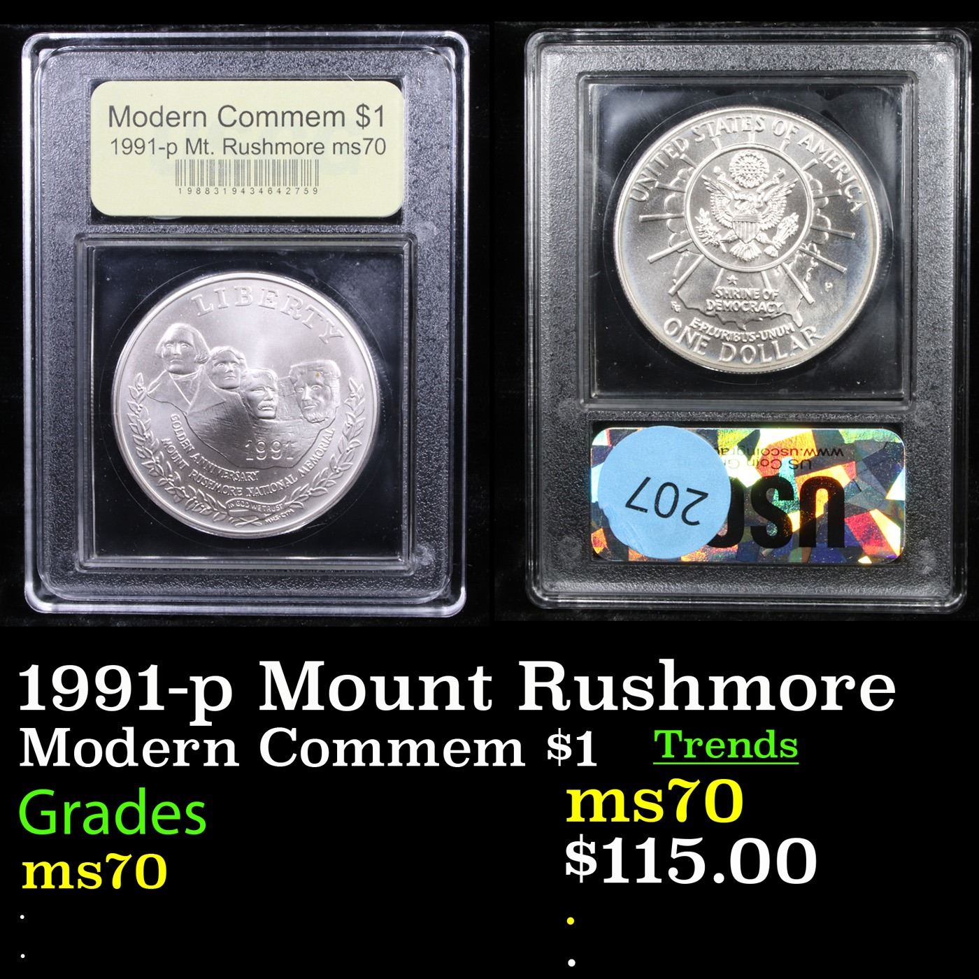 1991-p Mount Rushmore Modern Commem Dollar $1 Graded ms70, Perfection By USCG. Issued to celebrate the Golden Anniversary of The completion of Mount Rushmore. This coin is Graded perfection ms70 by USCG.