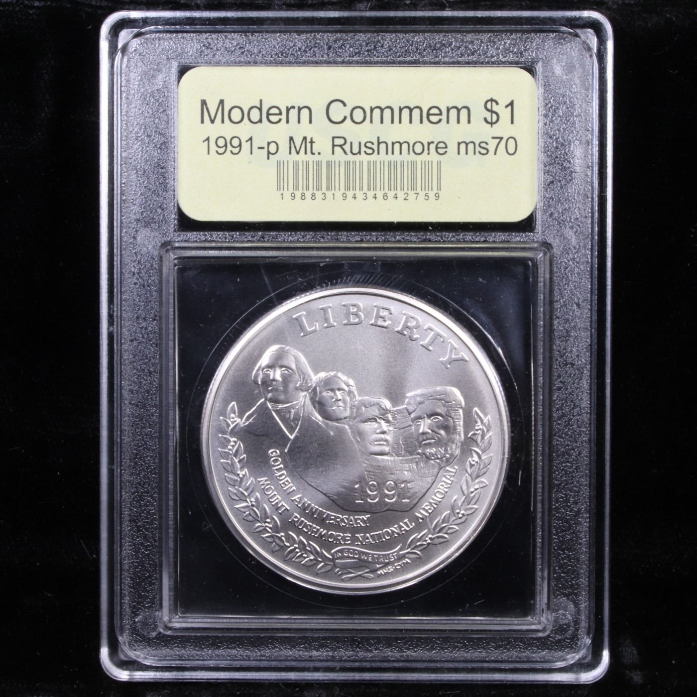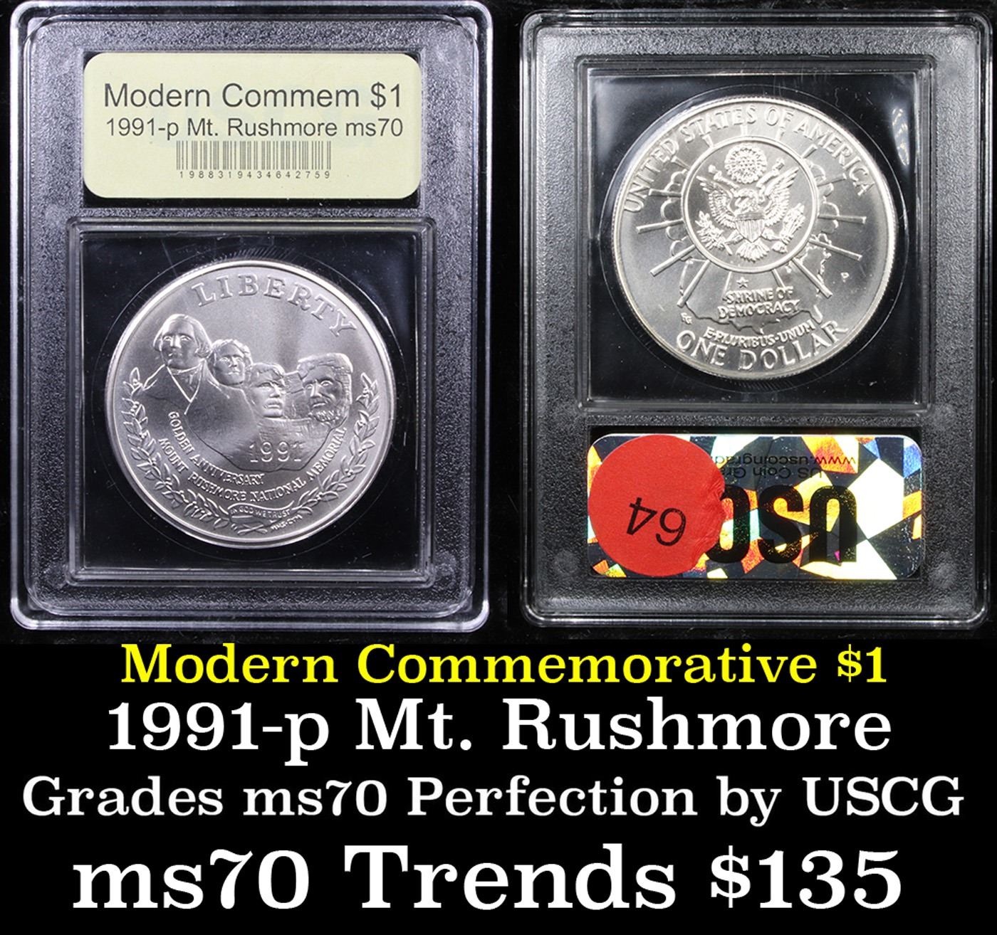 1991-p Mount Rushmore Modern Commem Dollar $1 Graded ms70, Perfection By USCG. 0 Issued to celebrate the Golden Anniversary of The completion of Mount Rushmore. This coin is Graded perfection ms70 by USCG.