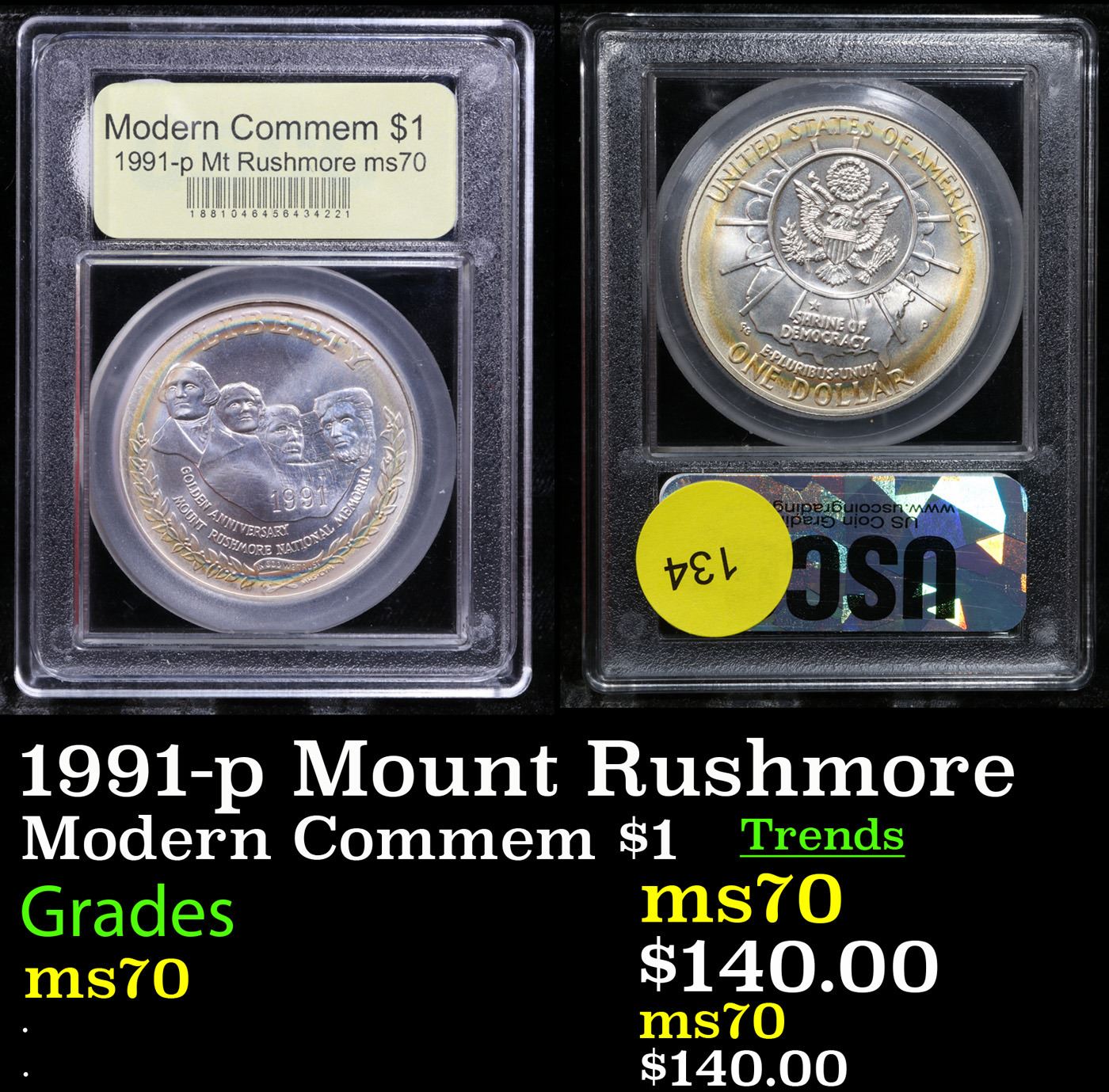 1991-p Mount Rushmore Modern Commem Dollar $1 Graded ms70, Perfection By USCG. The 1986 Statue of Liberty Commemorative Dollar was one of three commemorative coins issued to celebrate the 100th anniversary of the dedication of the Statue of Liberty. This coin is graded perfection ms70 by USCG.