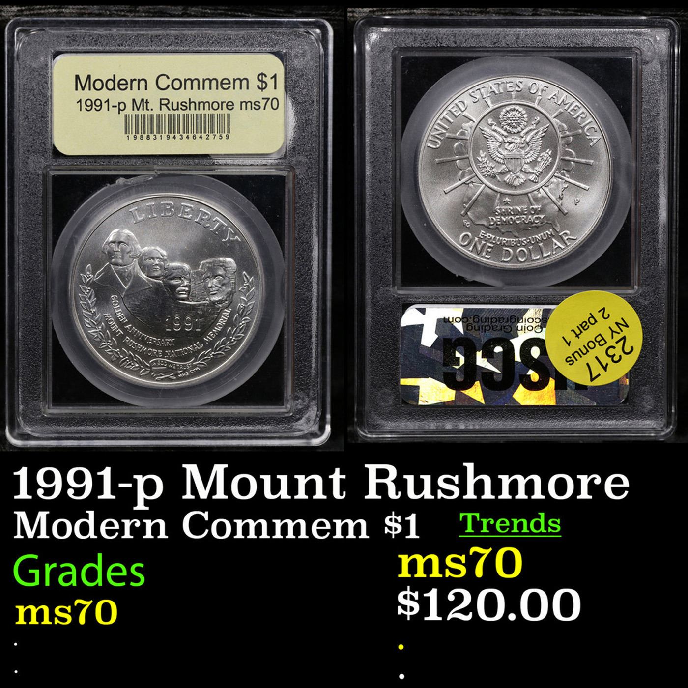 1991-p Mount Rushmore Modern Commem Dollar $1 Graded ms70, Perfection By USCG