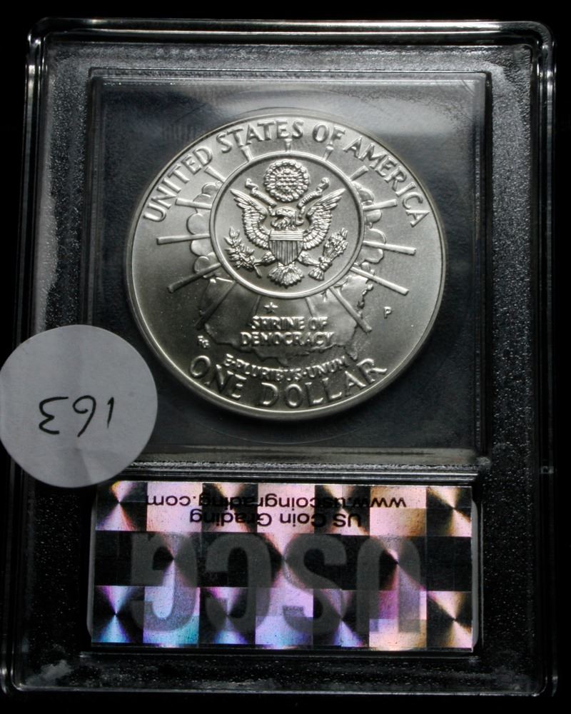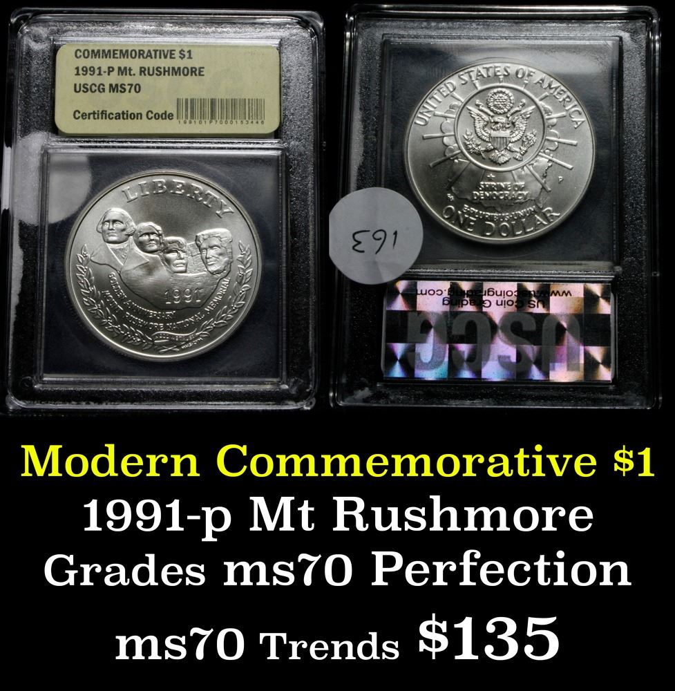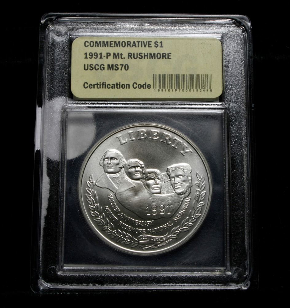 1991-p Mt. Rushmore Uncirculated Modern Commem Dollar $1 Graded ms70, Perfection by USCG. Issued to celebrate the Golden Anniversary of The completion of Mount Rushmore. This coin is Graded perfection perfection Gem++ Unc by USCG.