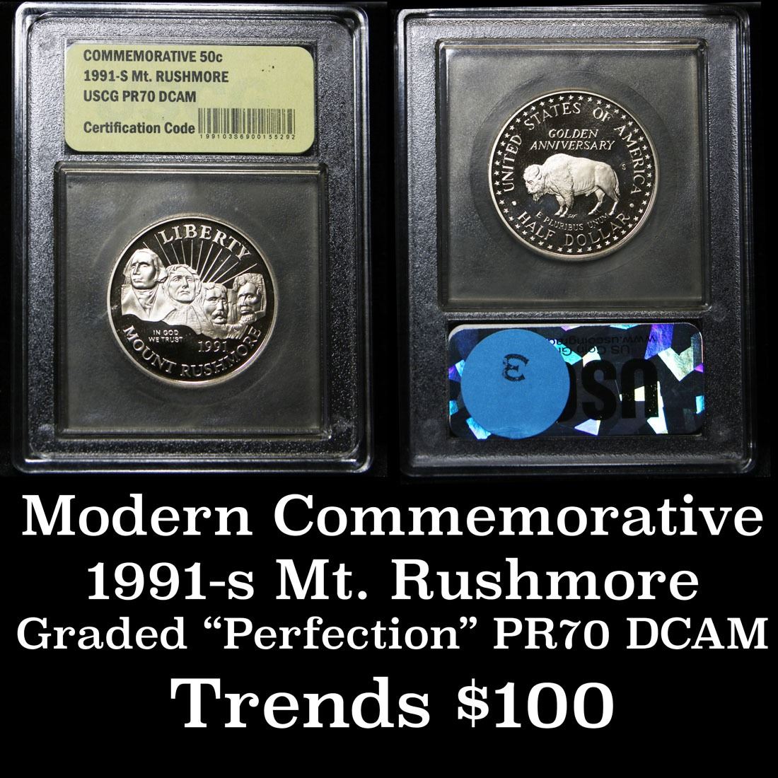 1991-s Mount Rushmore . . Modern Commem Half Dollar 50c Graded GEM++ Proof Deep Cameo by USCG. Per Ron Guth of PCGS : The Braided Hair half cents boast some of the lowest mintages of any U.S. coin types and are among the best values, as well. Every date in this type boasts a low mintage. By way of comparison, the mintage of the any Braided hair Half Cent is almost a fraction of the mintage of the 1909-S VDB Lincoln Cent (a far more valuable coin), making this an excellent value. This commemorative was Issued to celebrate the Golden Anniversary of The completion of Mount Rushmore. This coin is Graded perfection Gem+++ Proof Deep Cameo by USCG.