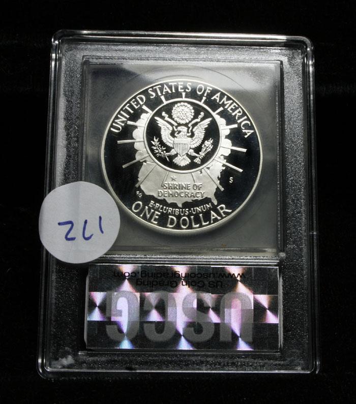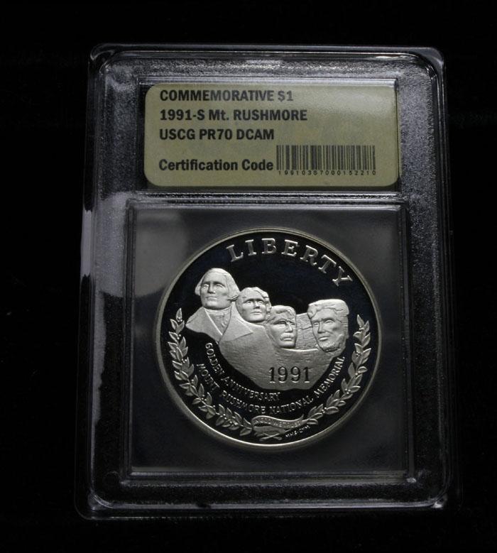 Issued to celebrate the Golden Anniversary of The completion of Mount Rushmore. PCGS lists a PR70 DCAM at $900. This coin is Graded perfect PR70 Deep Cameo by USCG. Estimated Value $250.