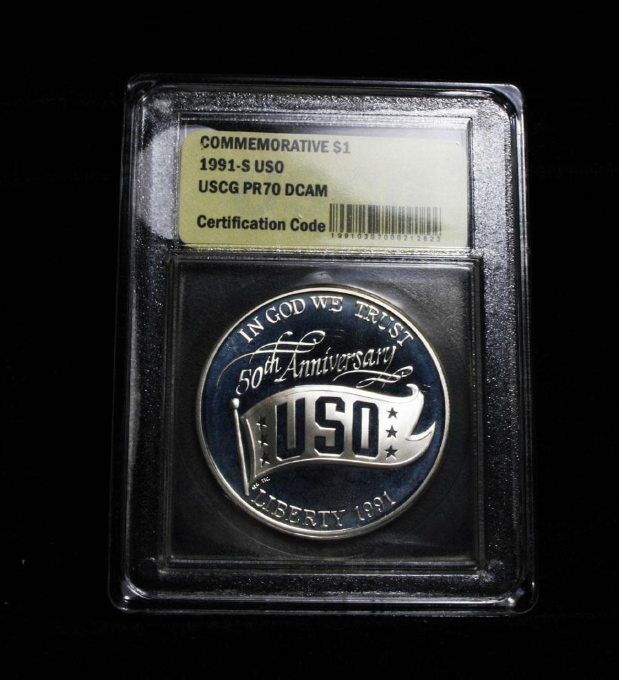 The 1991 USO Silver Dollar was released to mark the 50th anniversary of the United Service Organization. Encapsulated and Graded PR70 DCAM by USCG. PCGS lists a PR70 at $2750, very scarce. Estimated Value $250