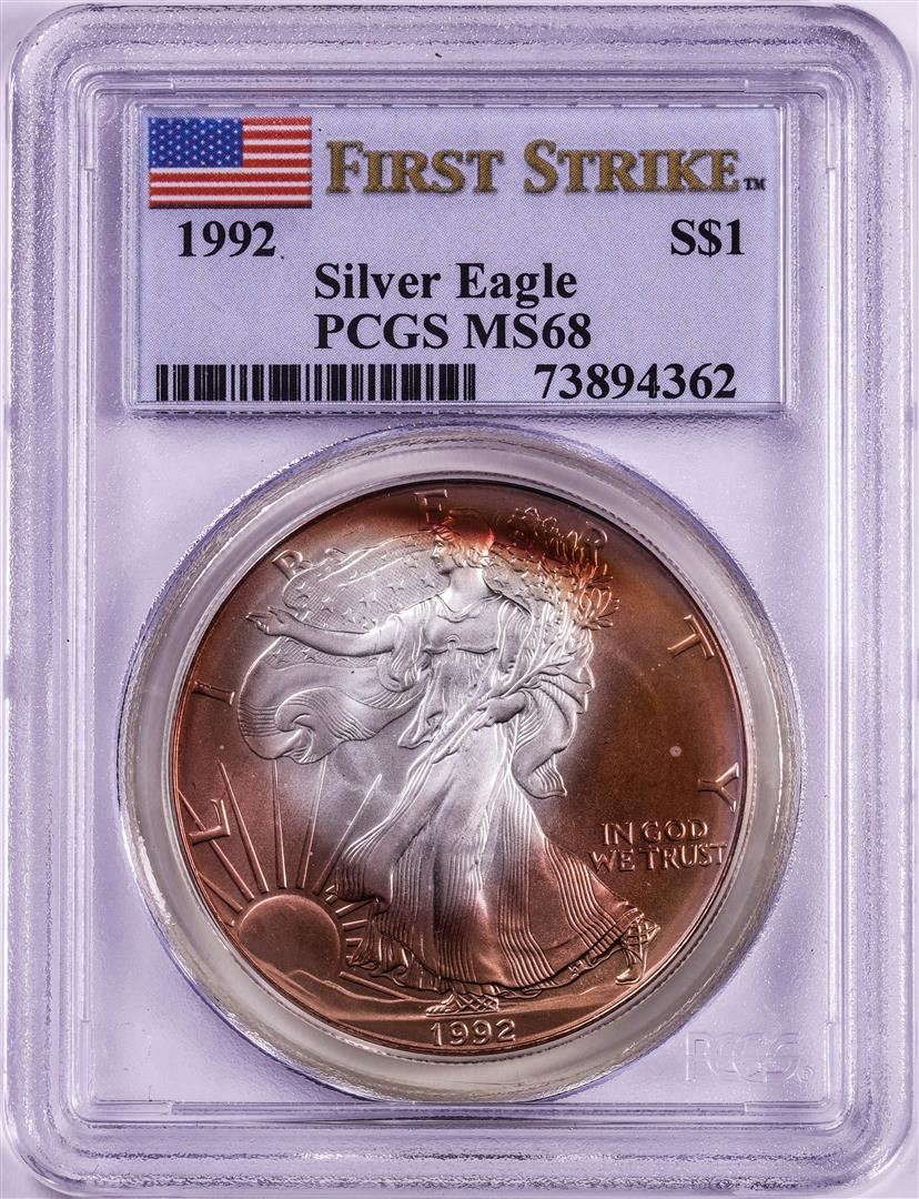 One 1992 $1 American Silver Eagle Coin PCGS MS68 First Strike Nice Toning. PCGS Graded.