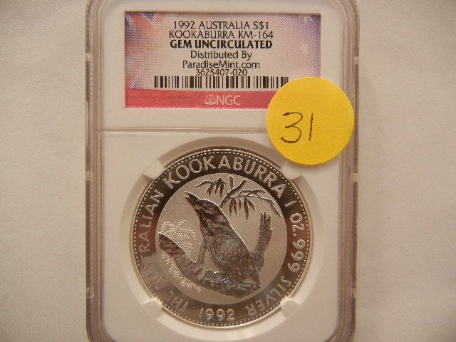 1992 $1 Australian Kookaburra, KM-164, GEM UNC, .999 Fine Silver, 1 Troy Oz., Graded by NGC