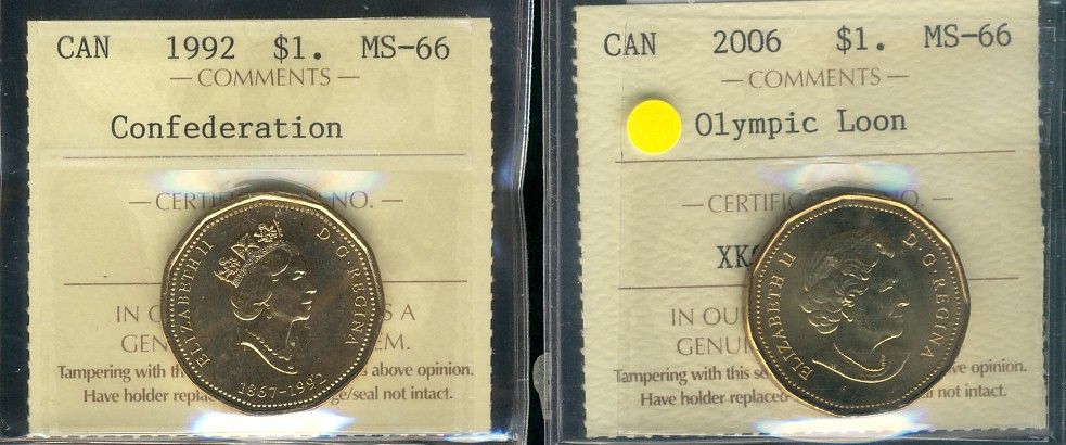 1992 $1 Confed & 2006 Olympic Loon ICCS MS66. Lot of 2 coins.