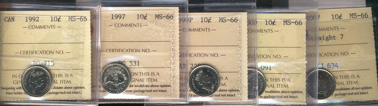 1992 10¢, 1997, 1999P, 2000 & 2007 St7 ICCS MS66. Lot of 5 coins.