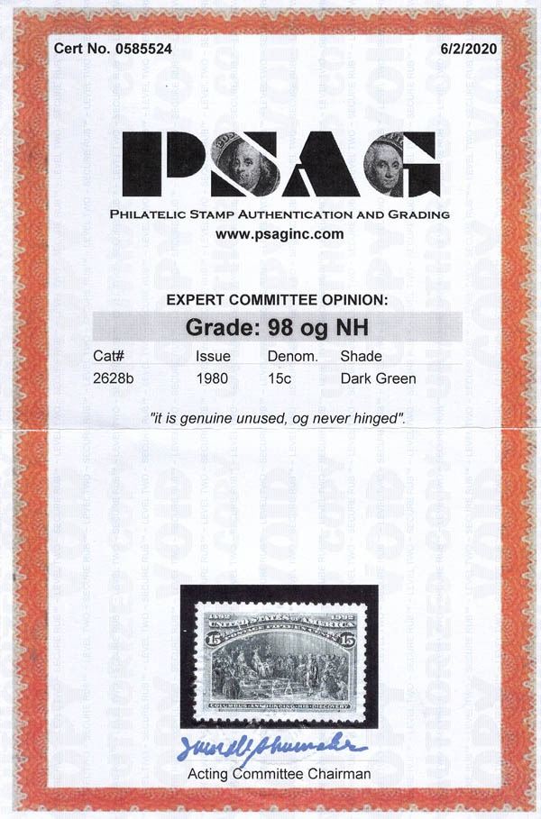 1992, 15¢ Voyages of Columbus, single from souvenir sheet. Scott 2628b. SMQ $85, Sup, with 2020 P.S.A.G. certificate graded SUP 98