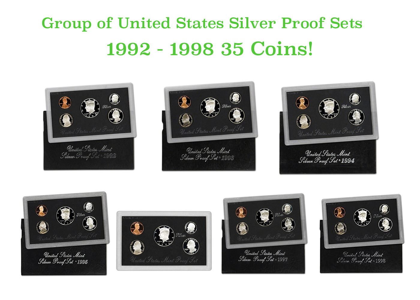1992-1998 United States Mint Silver Proof Set. 35 coins in total.
