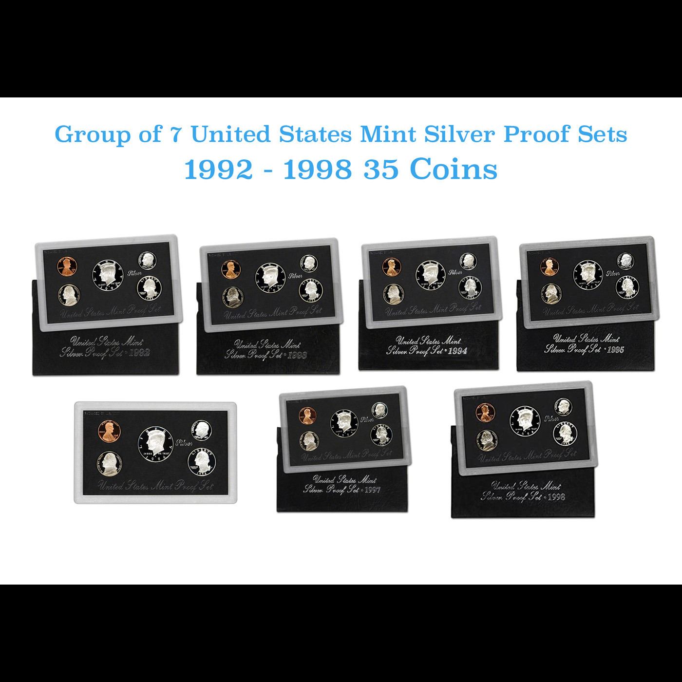 1992-1998 United States Mint Silver Proof Set. 35 coins in total.. 1992-1998 United States Mint Silver Proof Set. Each set contains a 90% silver Half Dollar, a 90% Silver Quarter, a 90% Silver Dime, a Jefferson Nickle and a Lincoln penny for a total of 35 coins. All pieces are Deep Cameo. The packaging for the 1992-1998 Silver Proof Set was themed in black, but otherwise similar to the packaging for the regular set. The coins were placed in individual spaces in a black cardboard. This was sealed within a plastic lens with the word “Silver” imprinted. The outer box was black and had silver printing “United States Mint Silver Proof Set 199_”.